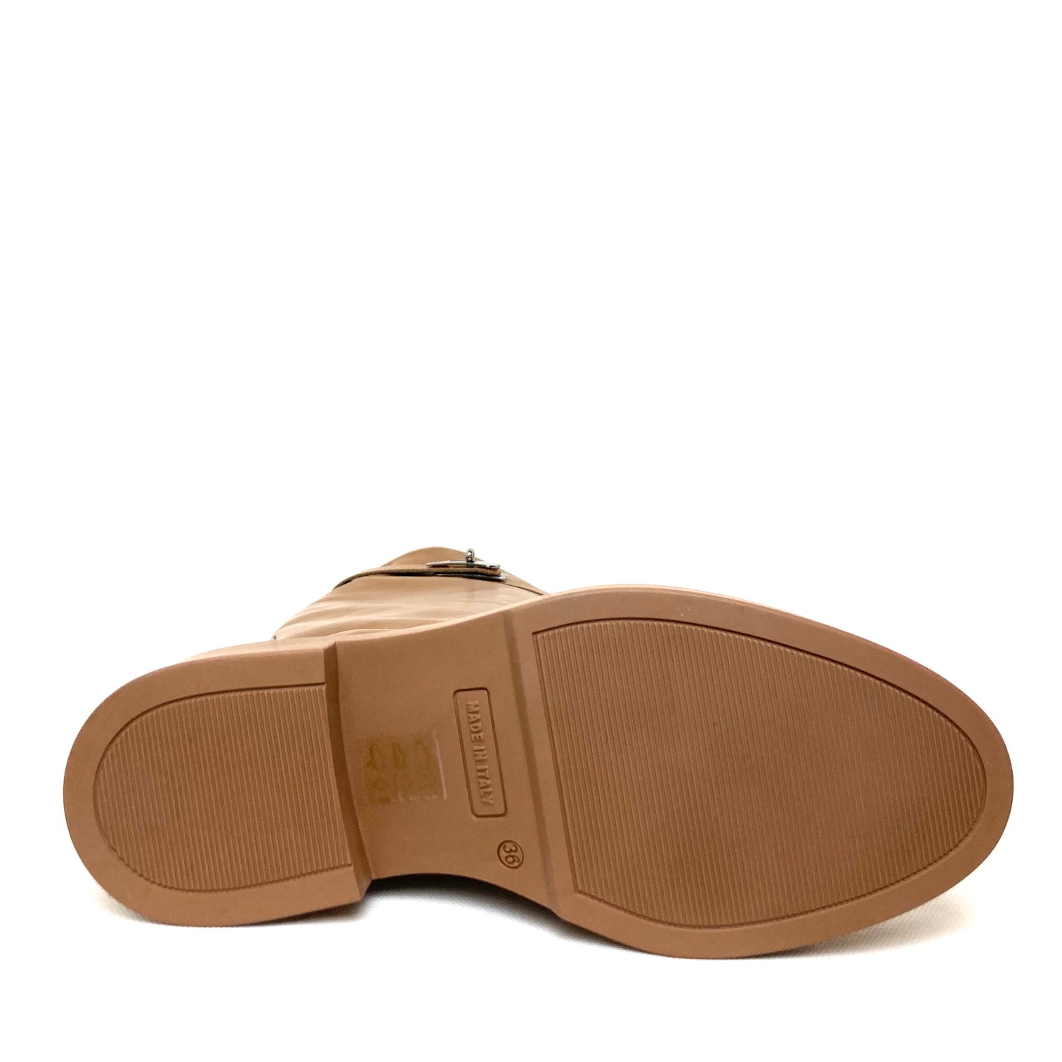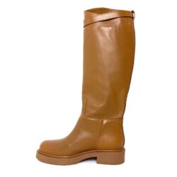 Stivale in pelle color cuoio, modello jumping, gambale interno h cm 36, esterno cm 42 con cinturino estraibile e fibbia cromata gomma in tinta, suola gomma in tinta 100% Made in Italy.