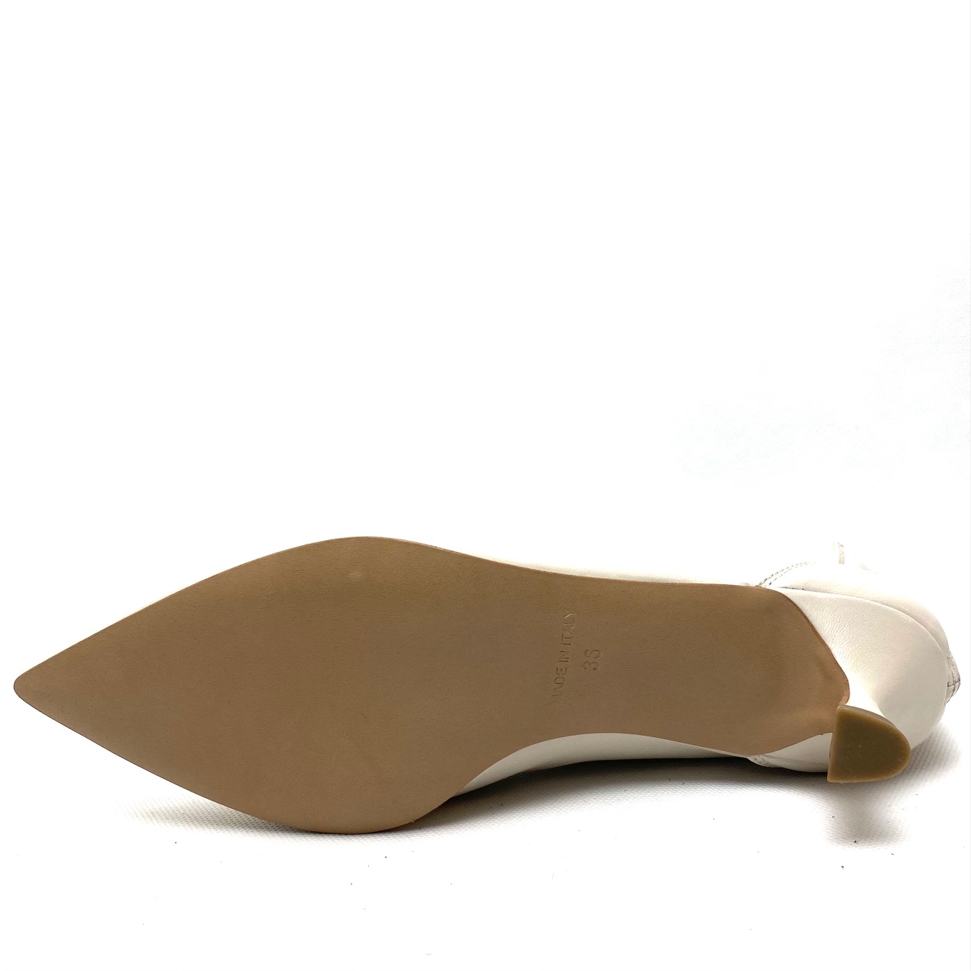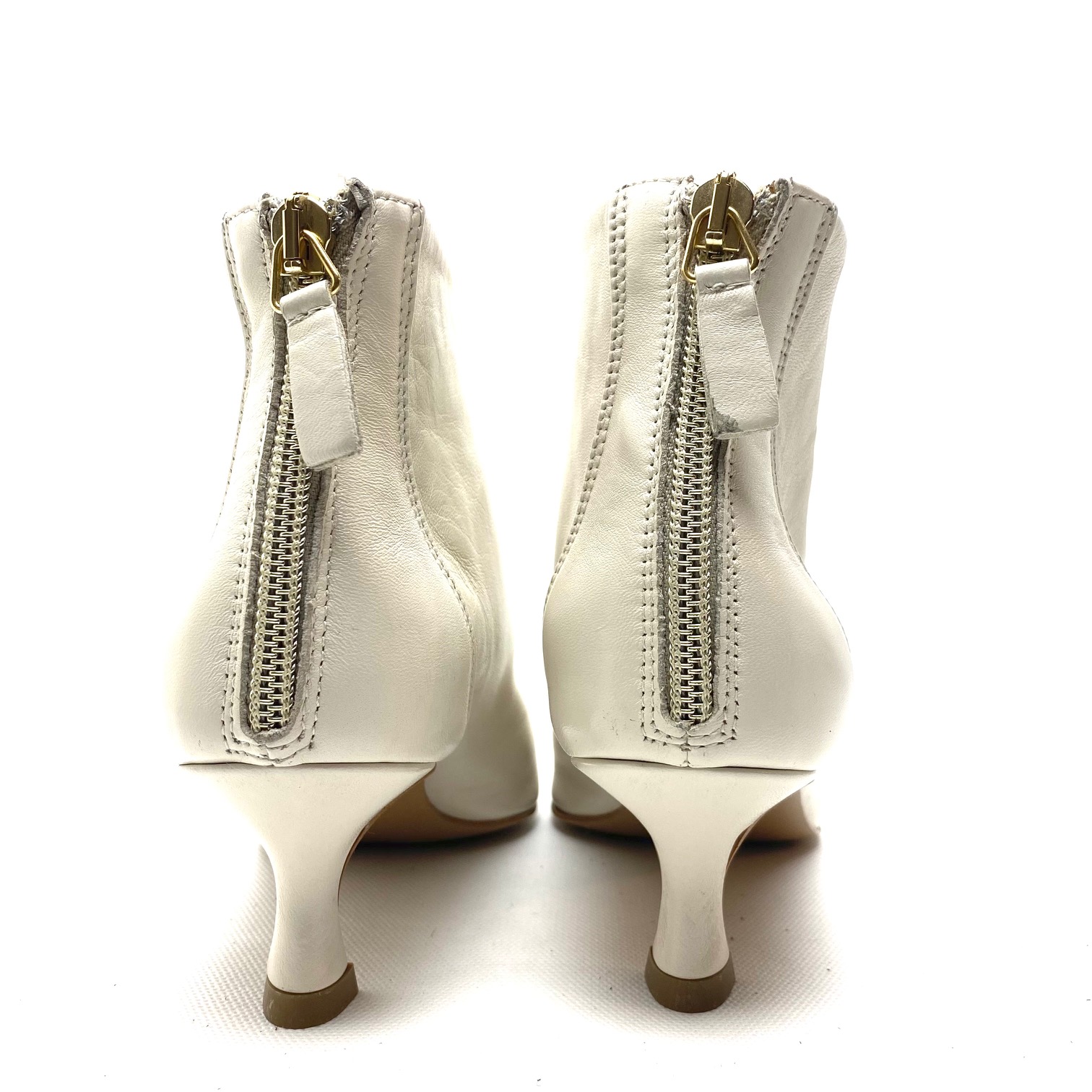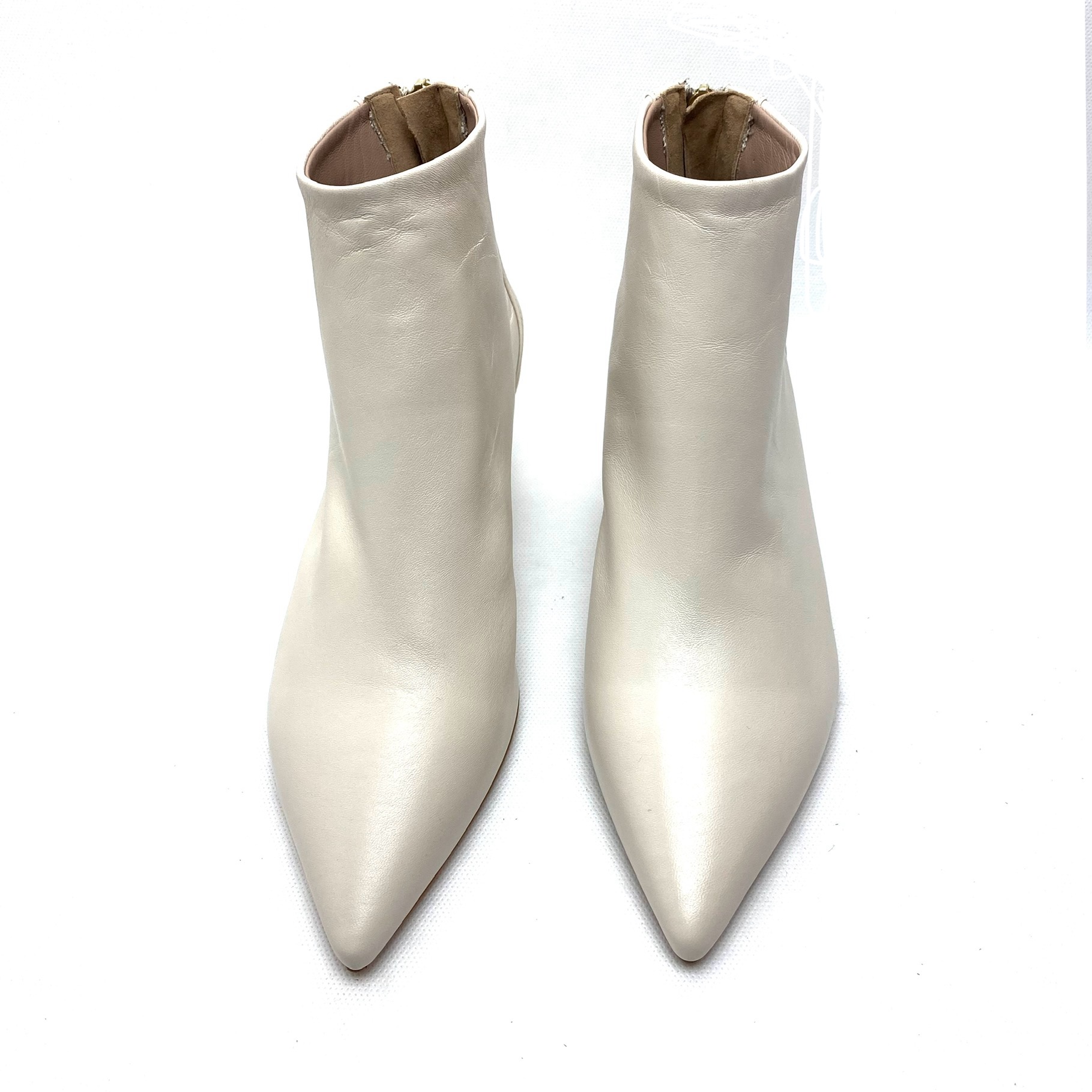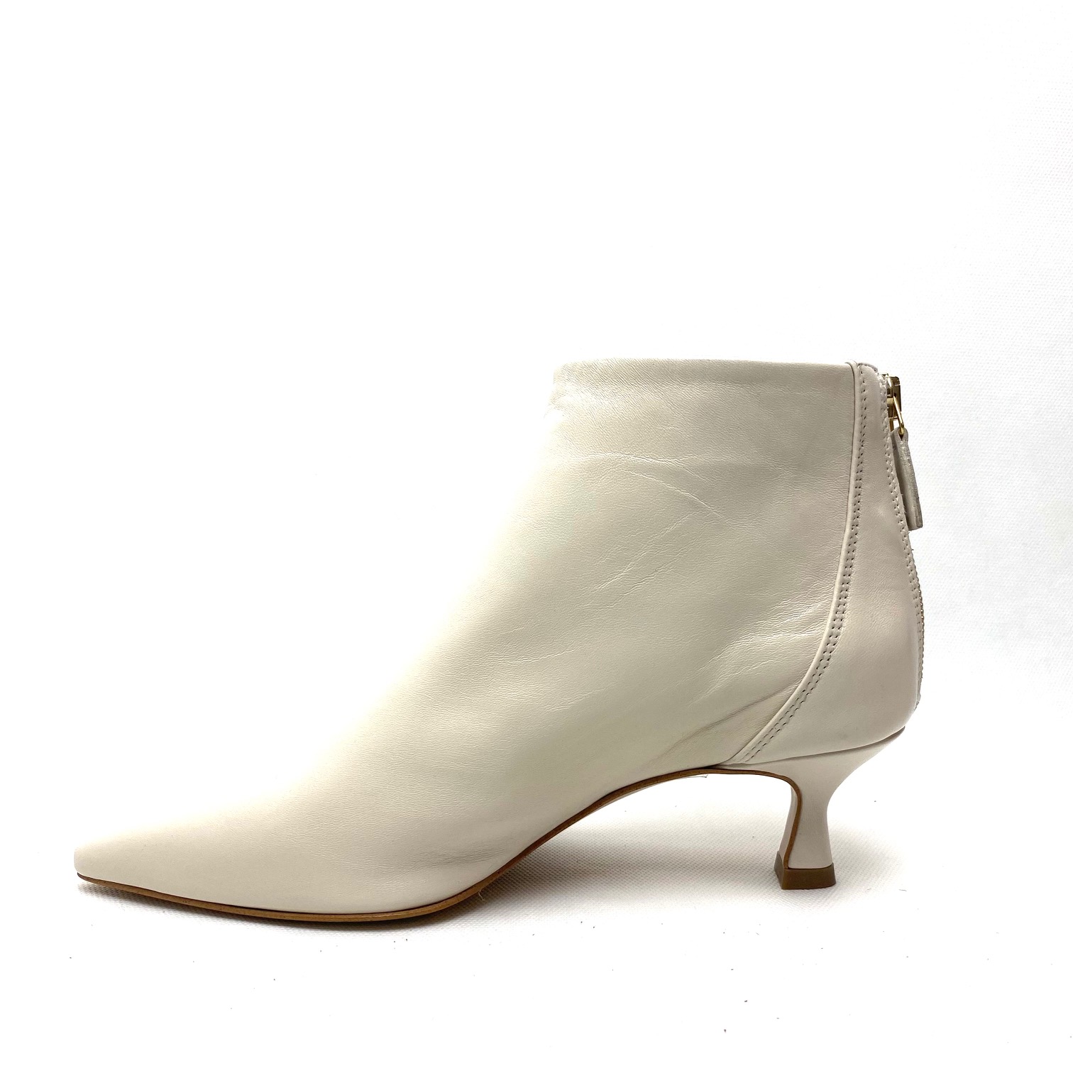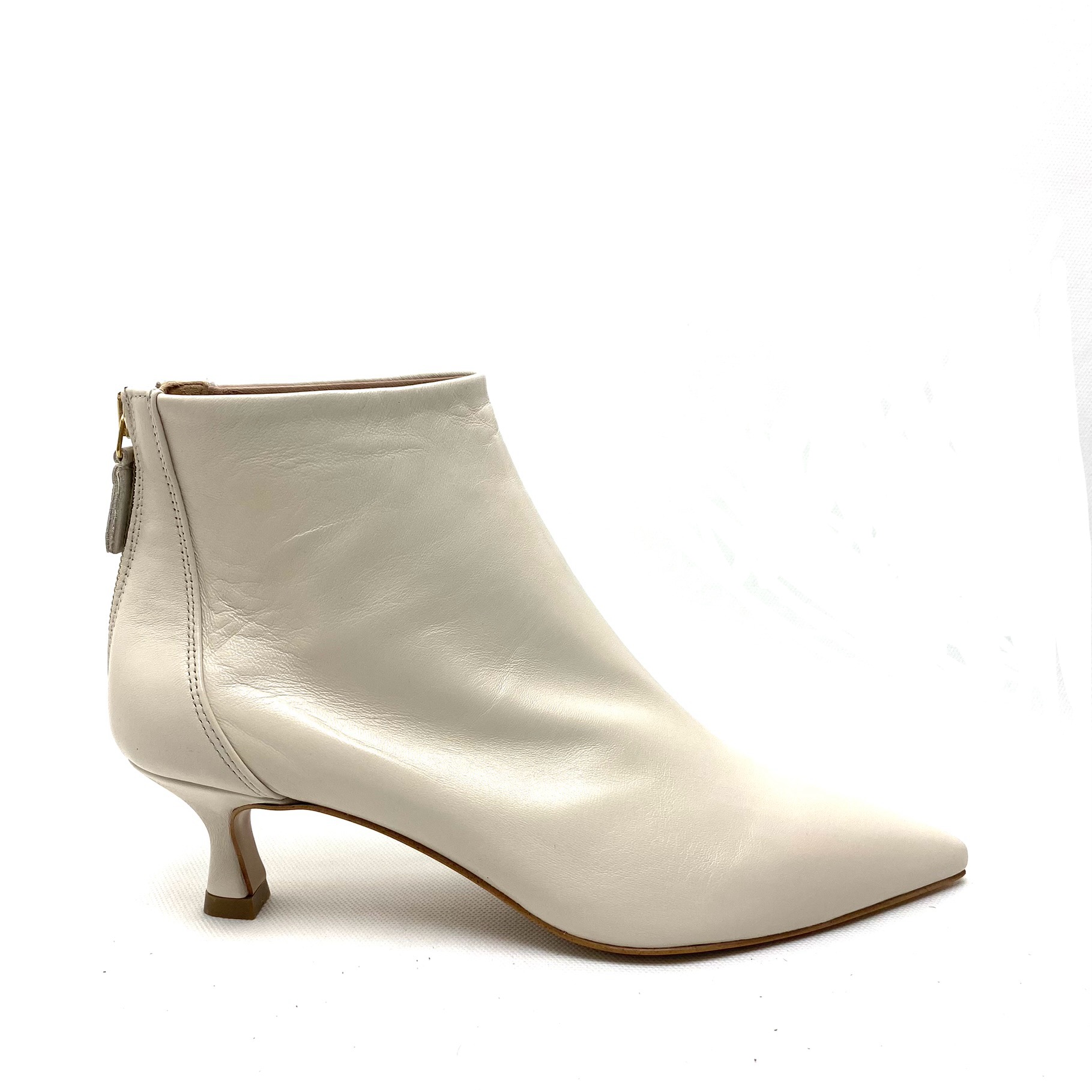 Tronchetto burro in pelle nappa con zip sul tallone, forma a punta e fodera pelle. Suola in gomma, tacco a rocchetto cm 5