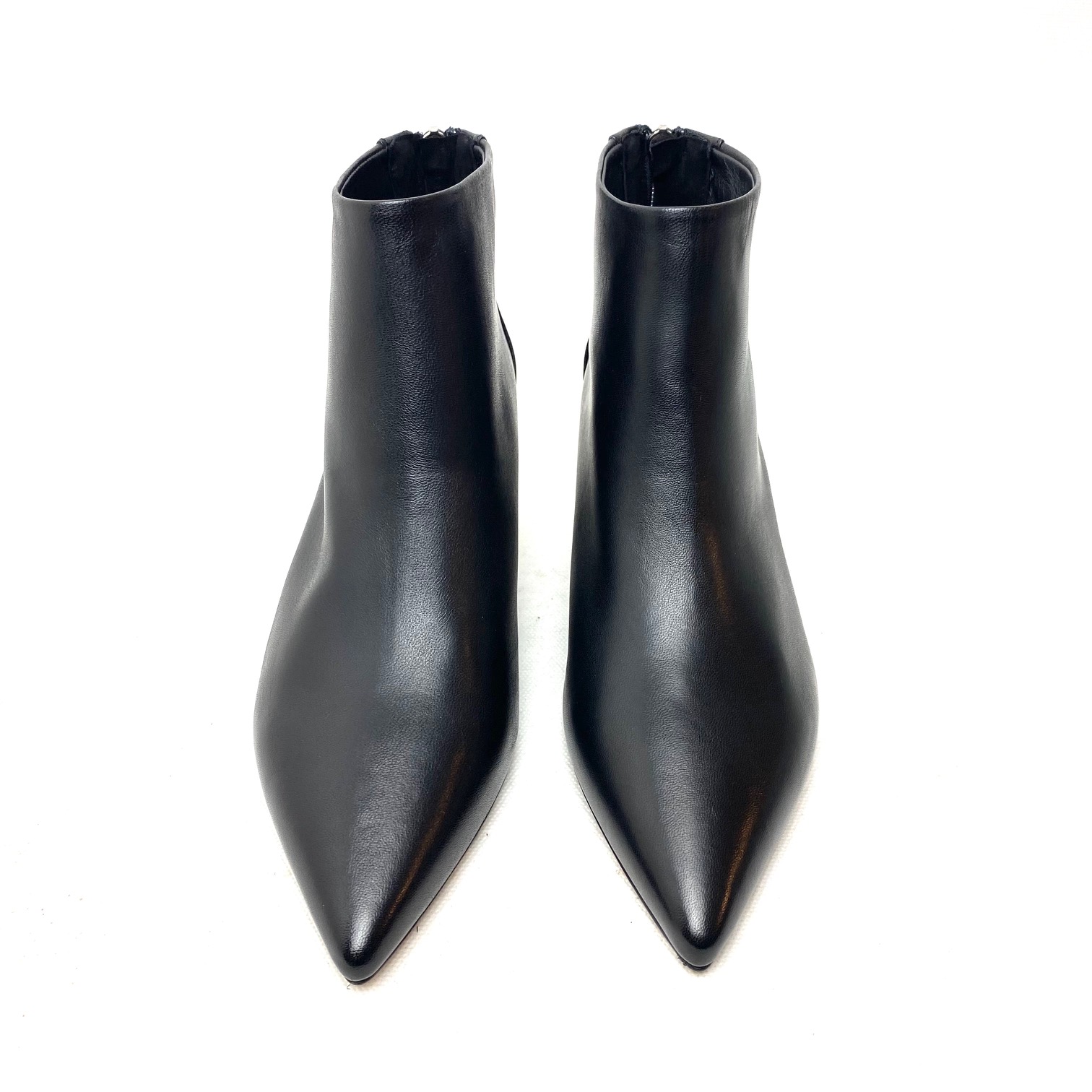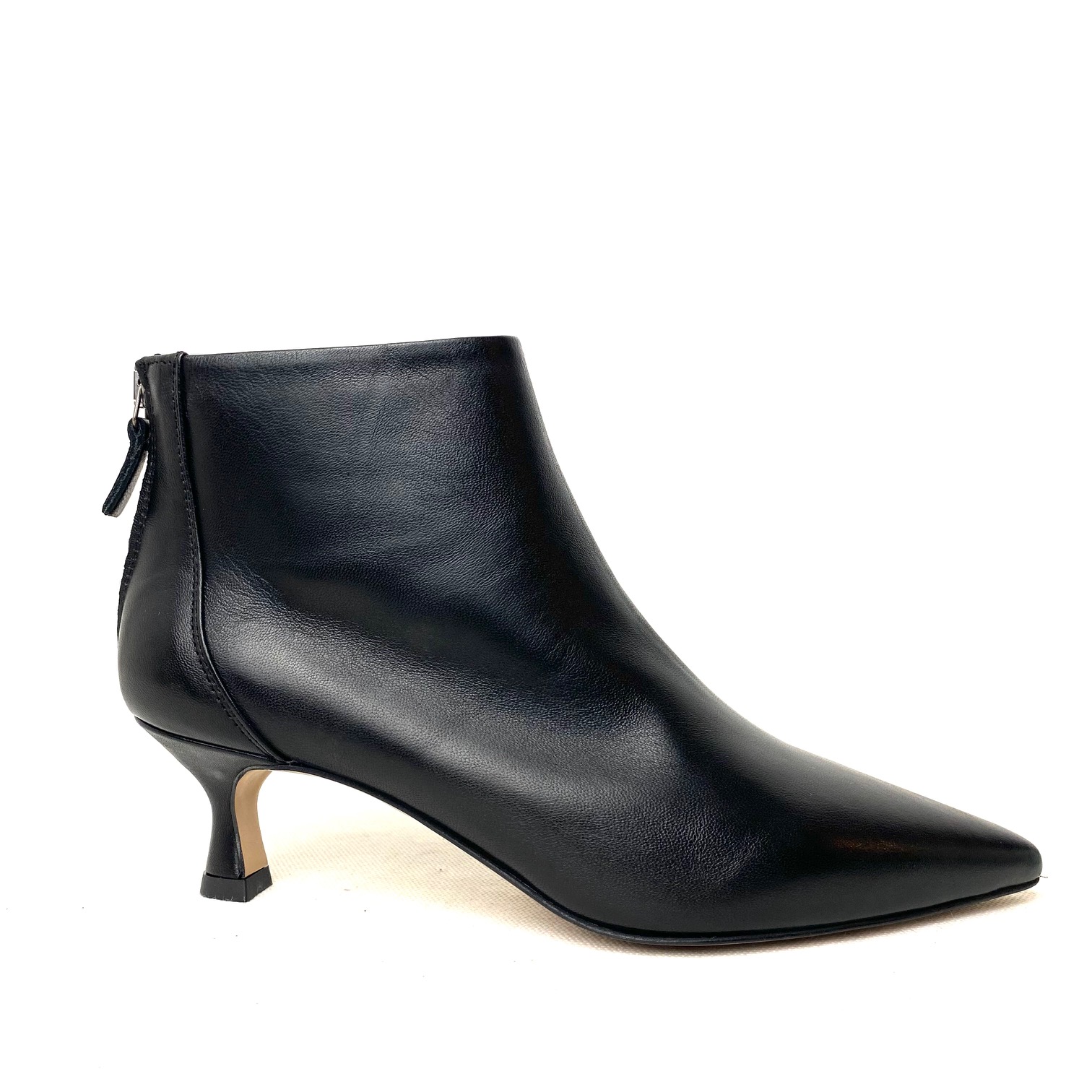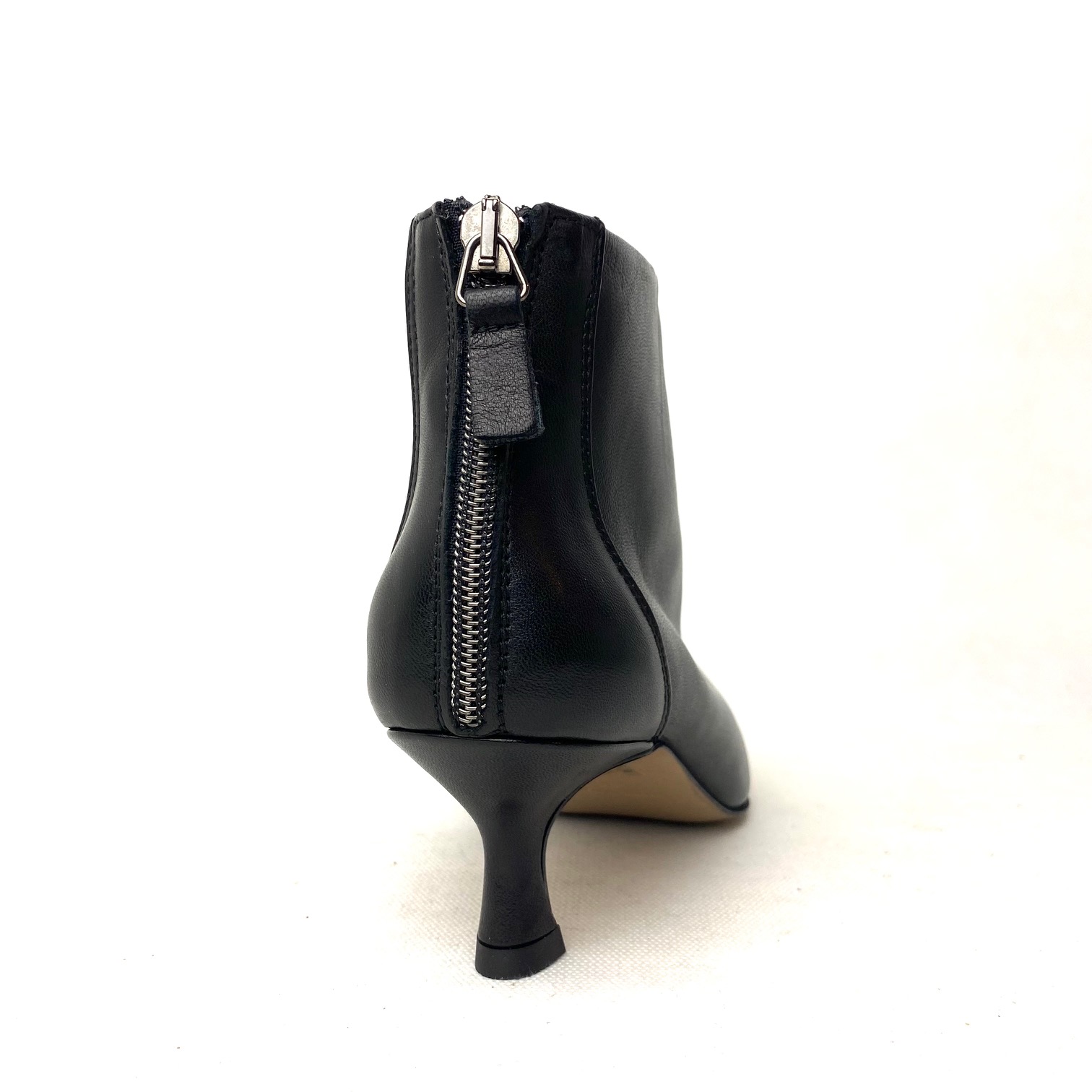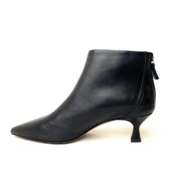Tronchetto in pelle nappa colore nera con zip sul tallone, forma a punta e fodera pelle. Suola in gomma, tacco a rocchetto cm 5