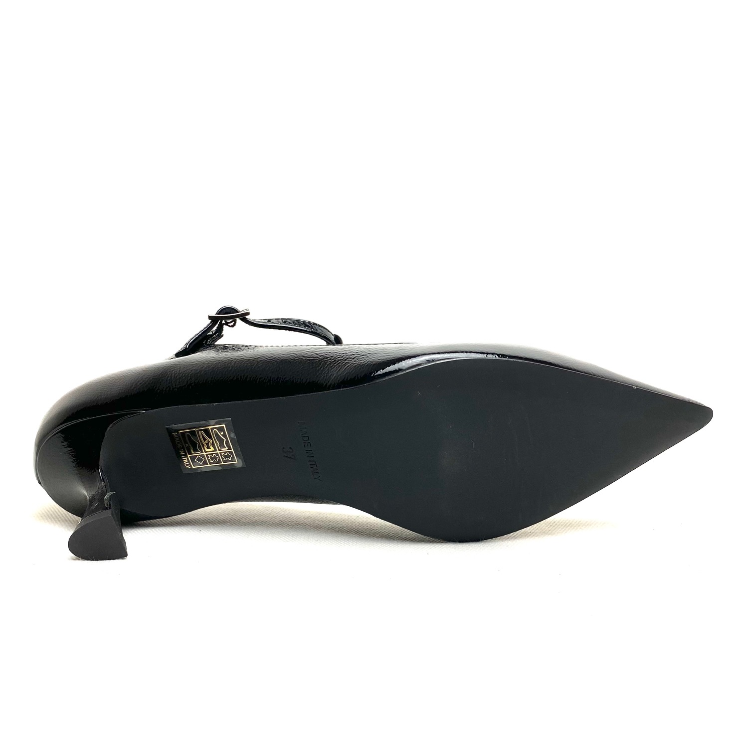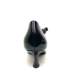 Scarpa forma a punta, modello t-strap in pelle naplack nera, fodera pelle e sottopiede morbido, fondo gomma e tacco a rocchetto cm 5