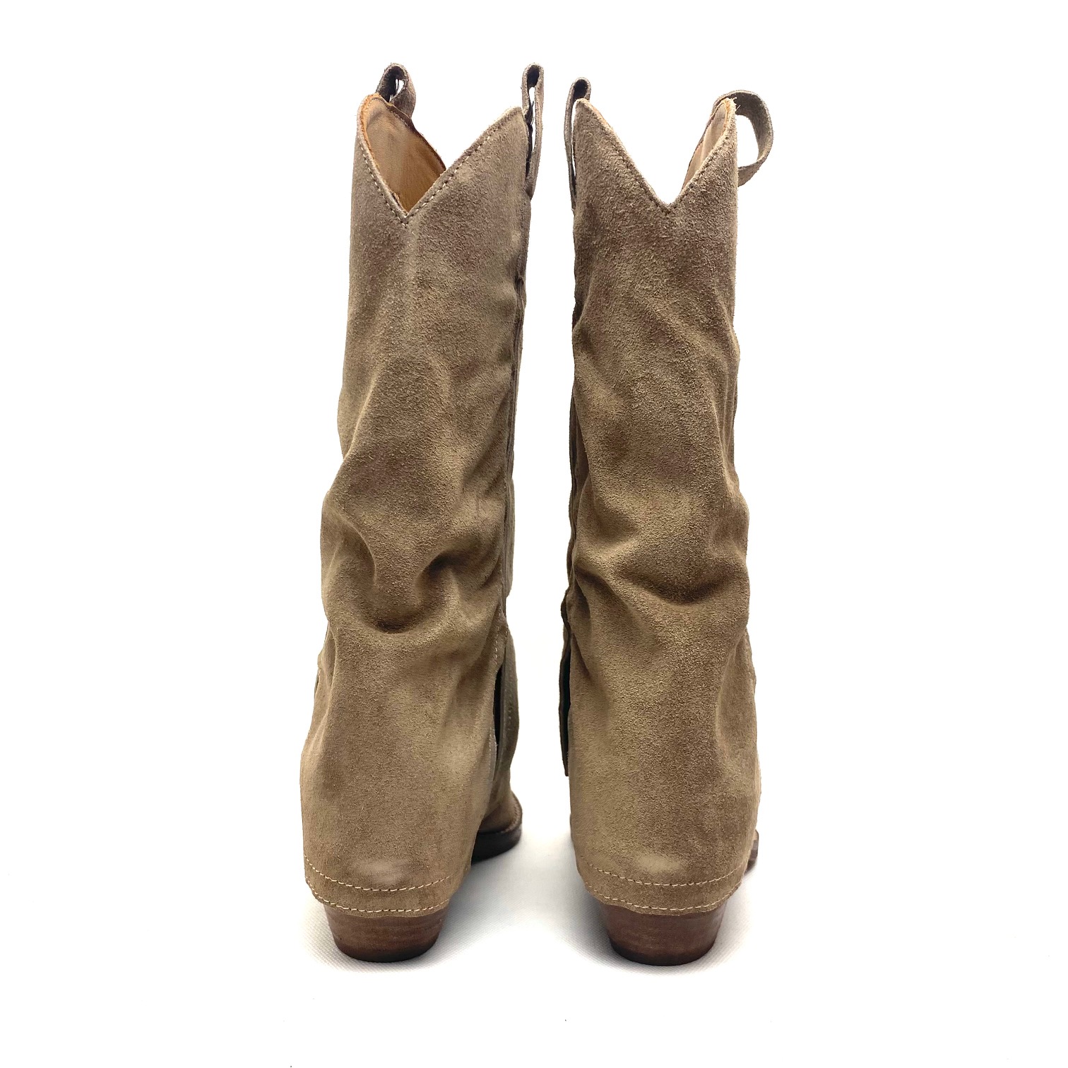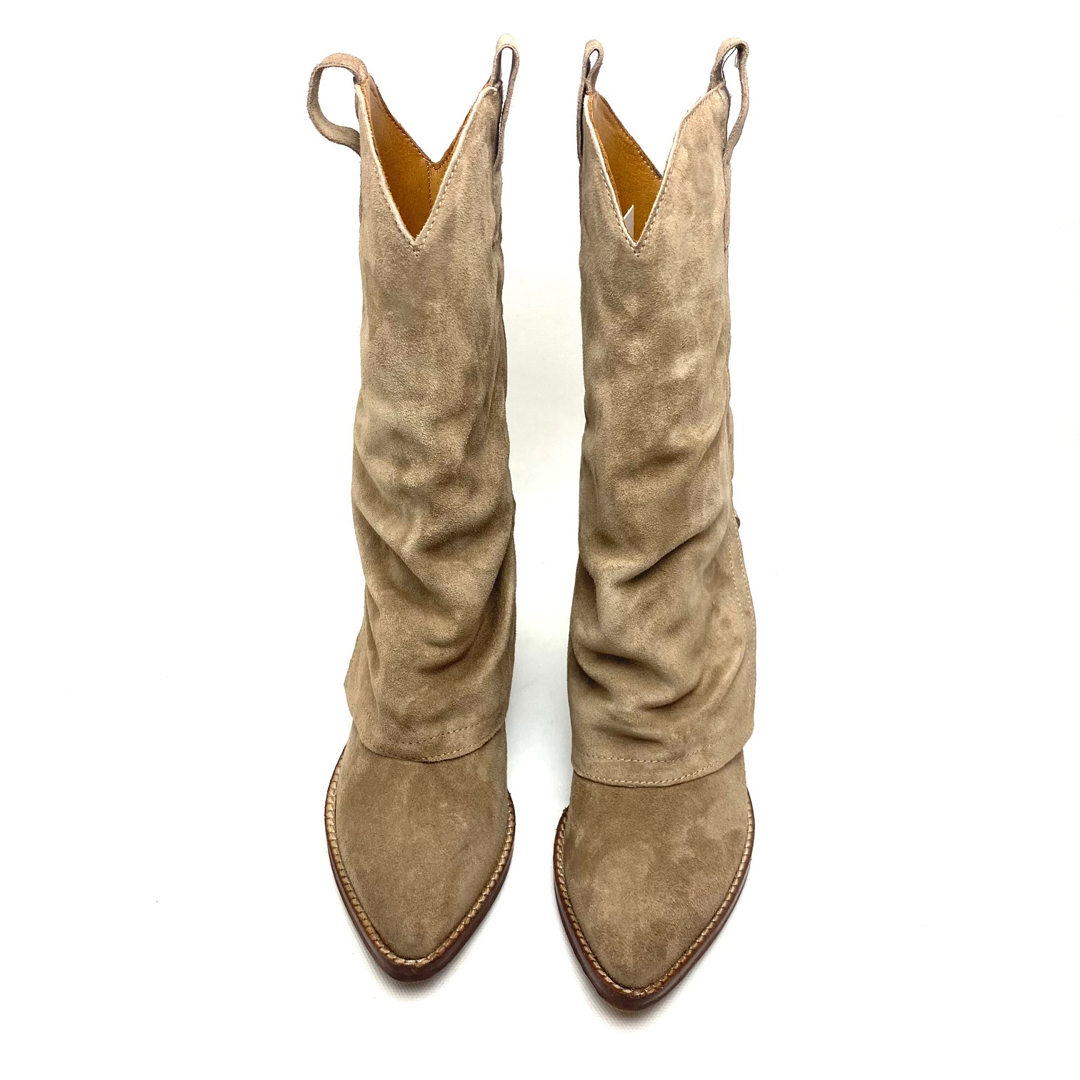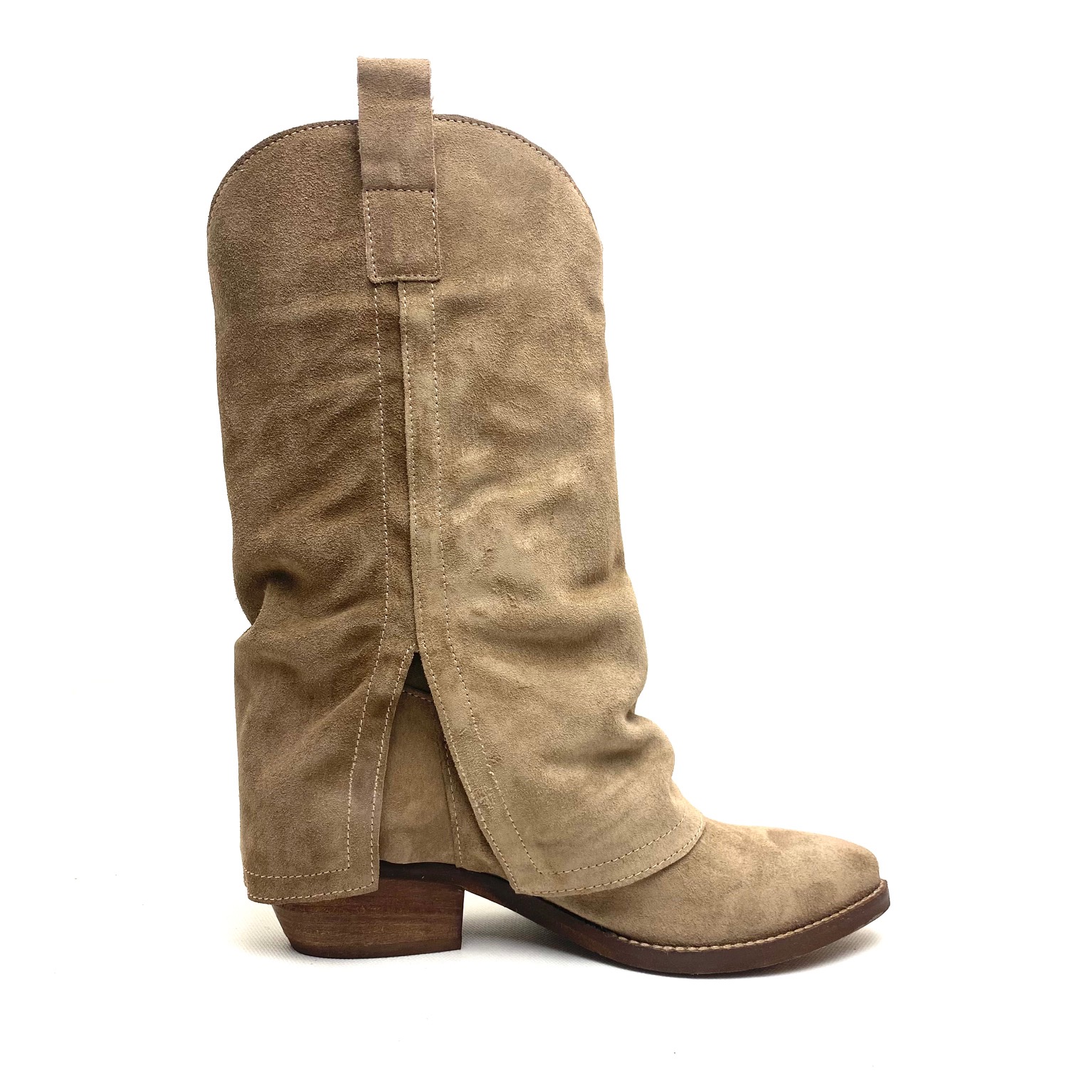 Texano in camoscio corda, con risvolto, gambale h cm 30. Fodera pelle, suola gomma tacco cm 5. 100% Made in Italy