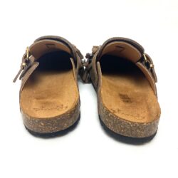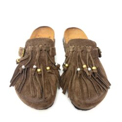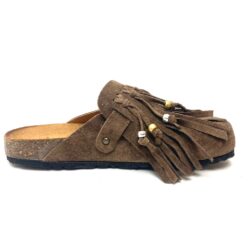Ciabatta a sabot in pelle camoscio radice con fibbia regolabile e frange decorative. Plantare fusbett in pelle scamosciata, fondo gomma. 100% Made in Italy