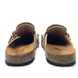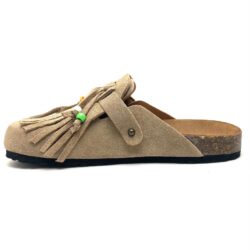 Ciabatta a sabot in pelle camoscio radice con fibbia regolabile e frange decorative removibili .Plantare fusbett in pelle scamosciata, fondo gomma. 100% Made in Italy