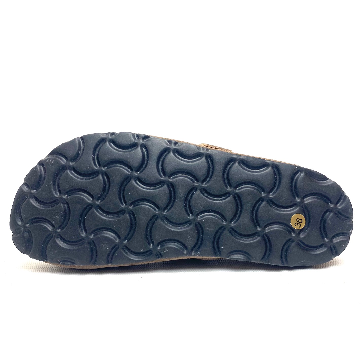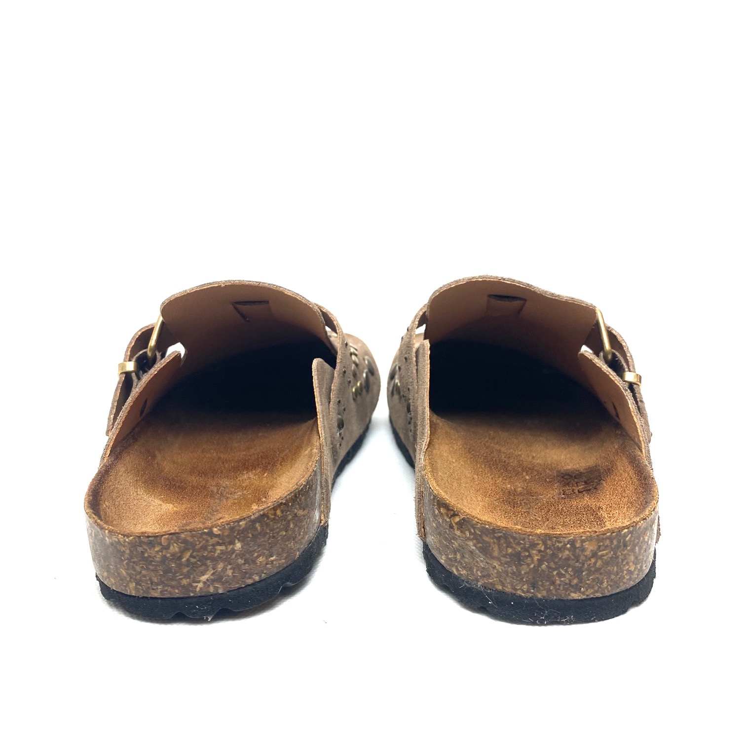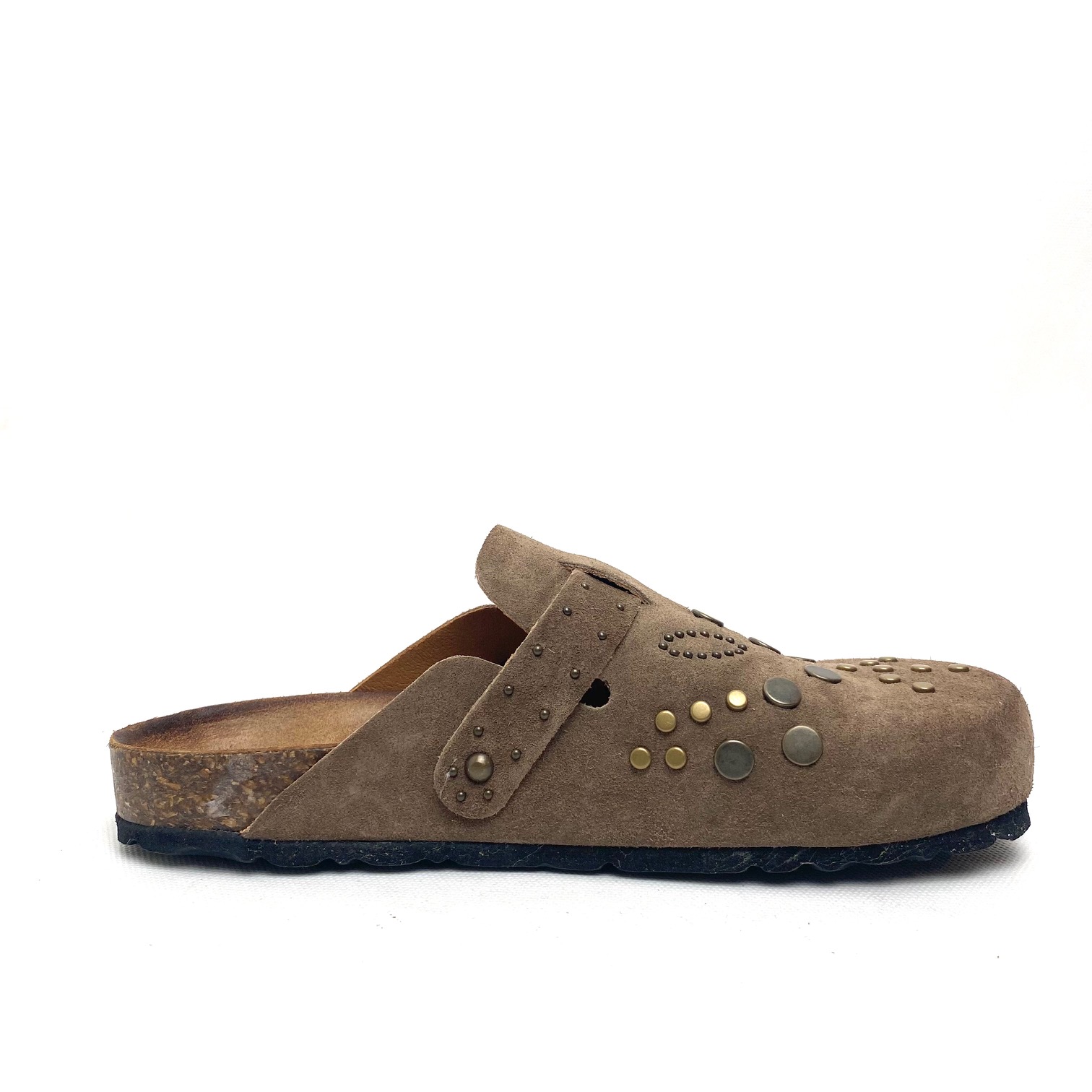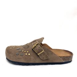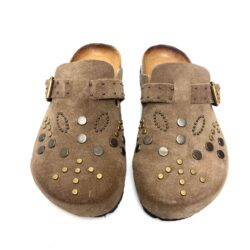 Sabot decorato con borchie in camoscio corda con fibbia regolabile, fondo fusbett suola in gomma. 100% Made in Italy