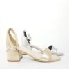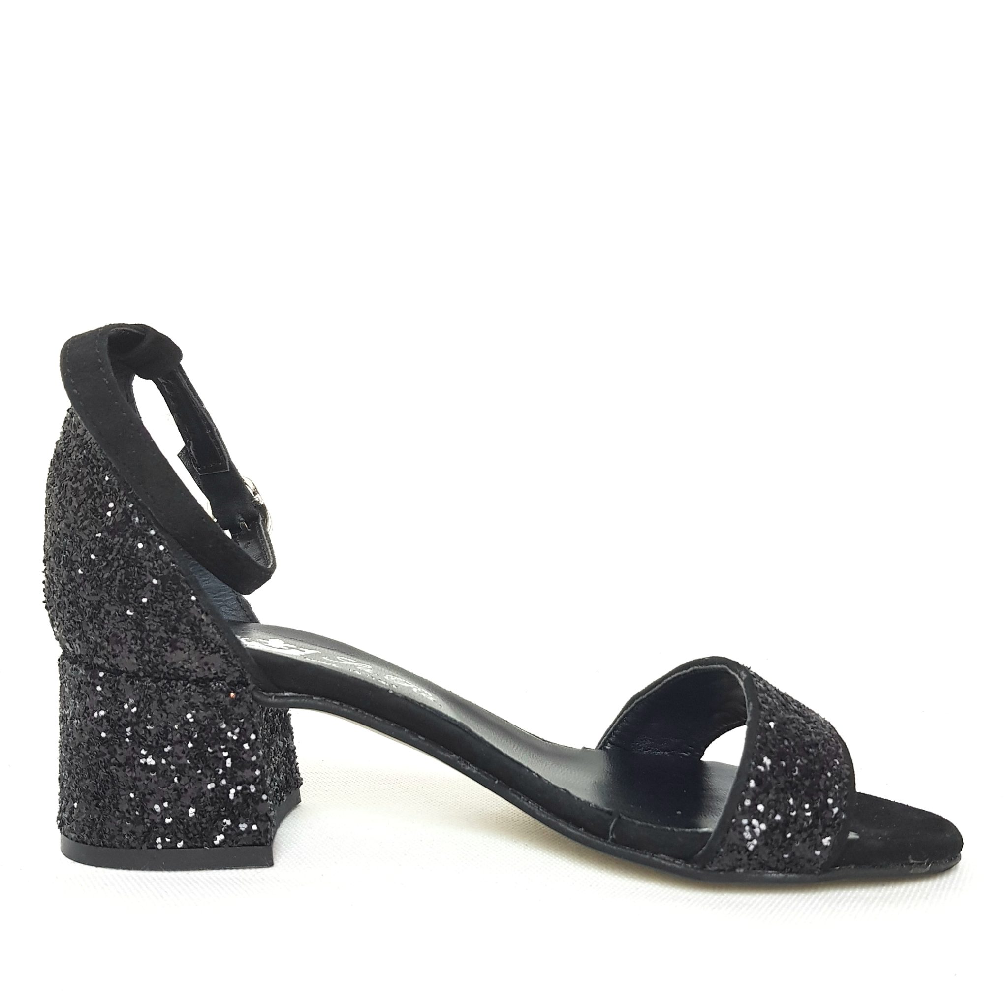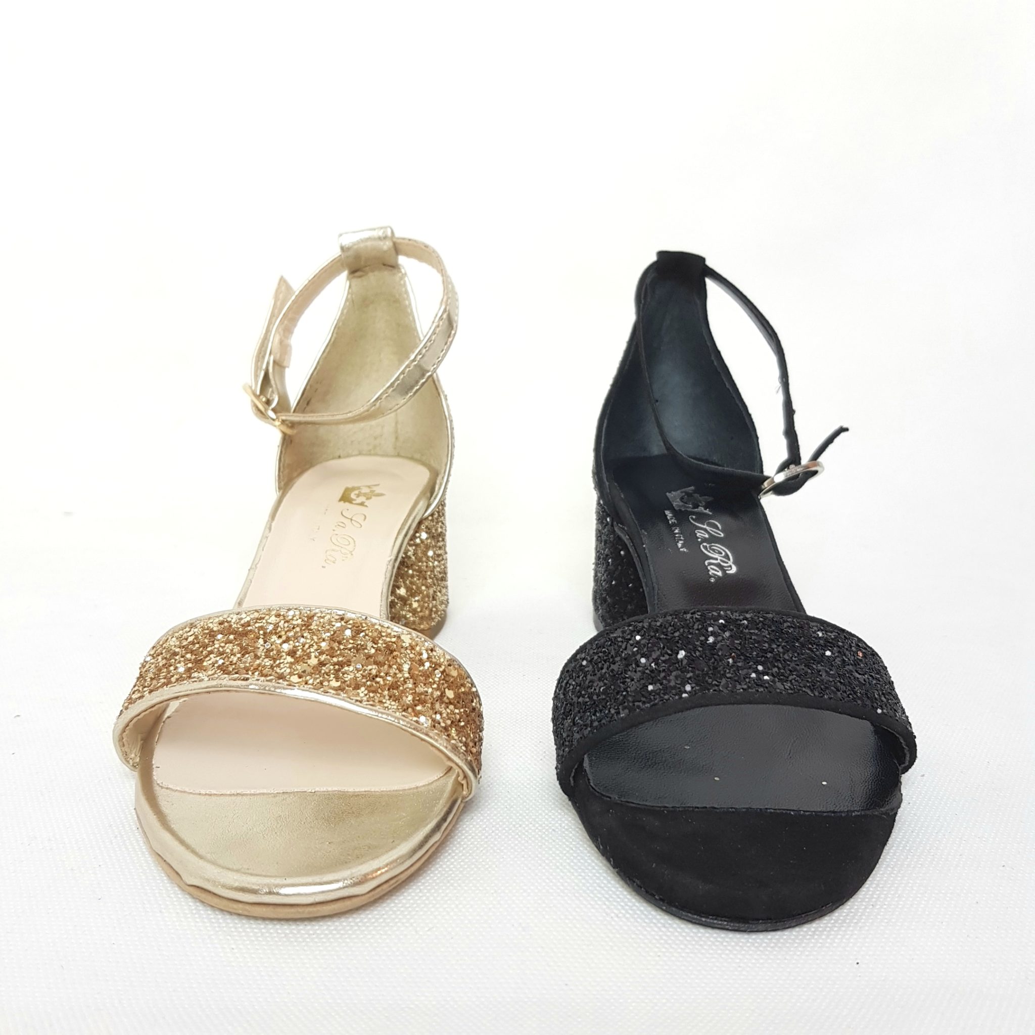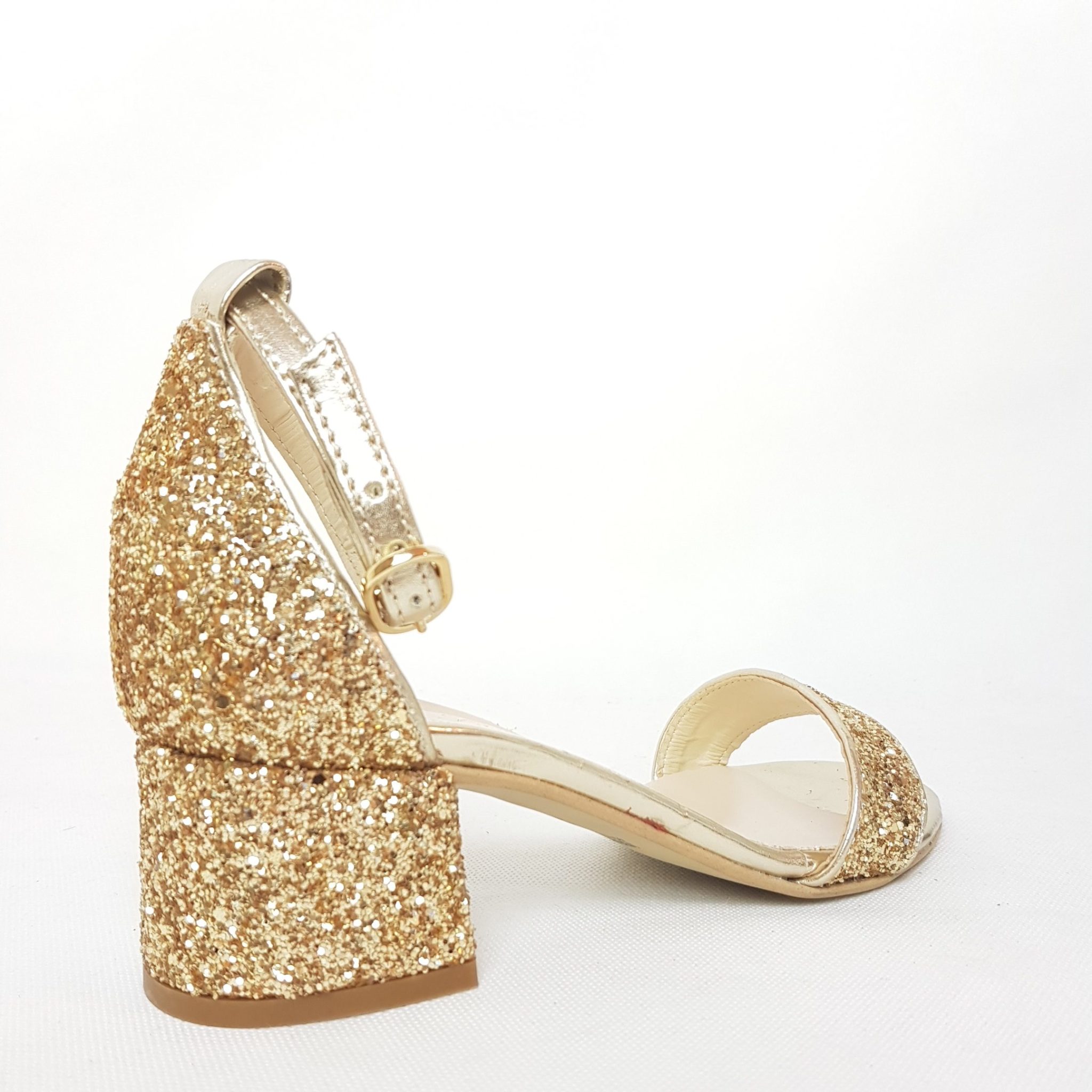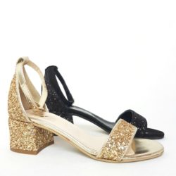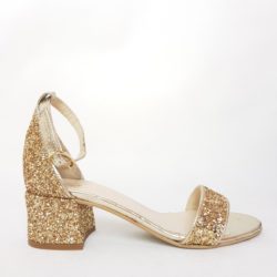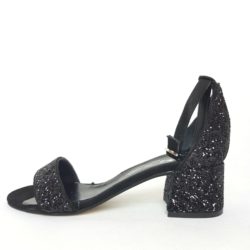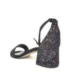 Sandalo in pelle – glitter. Allacciatura regolabile tramite cinturino alla caviglia. Altezza tacco 4 cm. Fondo gomma. Made in Italy. Colori: glitter oro, glitter nero.
