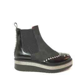 Stivaletto Chelsea in pelle nera e tessuto elasticizzato. Applicazioni: borchie in metallo argentato. Fondo gomma. Para 4 cm. Made in Italy.