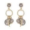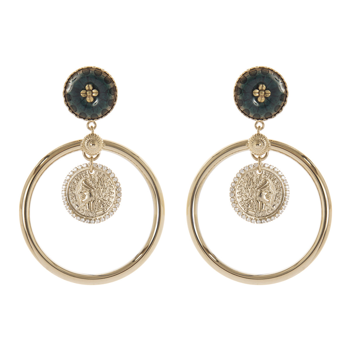 Unici e sontuosi questi orecchini fanno risplendere ogni donna in tutto il suo fascino. Design con cromatico bottoncino al lobo dal quale cade uno splendente grande anello che al suo interno presenta un medaglione impreziosito da brillantini. Una coppia di accessori classici e contemporanei al tempo stesso, nelle loro tonalità dell’oro e argento, da abbinare a qualsiasi outfit. Logo Sodini sul retro.