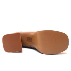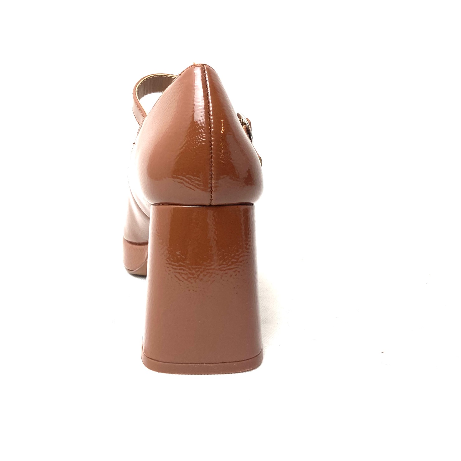 Scarpa bebè in pelle lucida vegan color cognac. Forma squadrata, plateau h cm. 1,5, tacco h cm 8, suola in gomma.