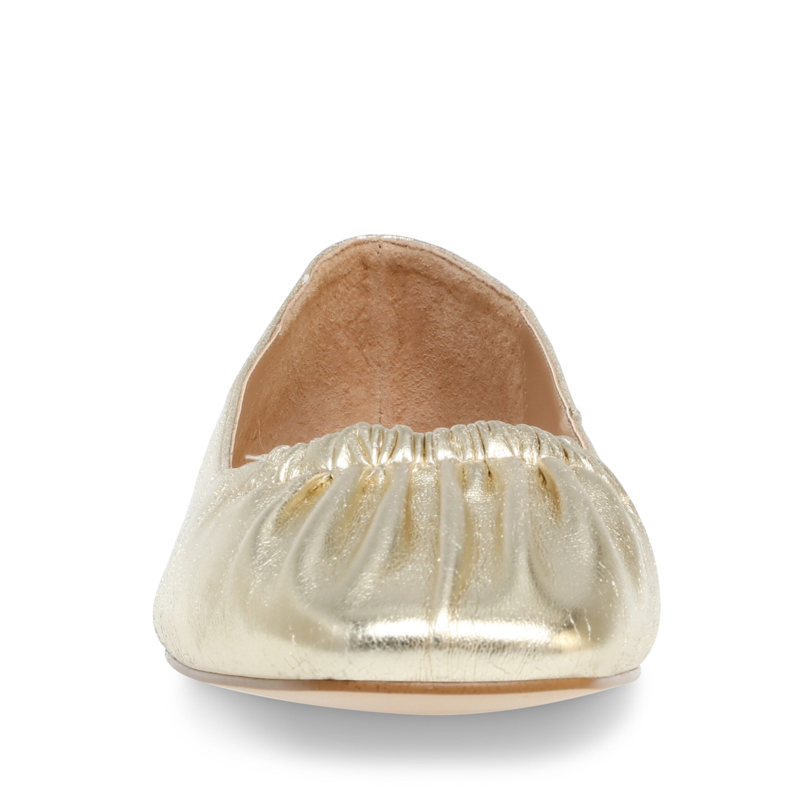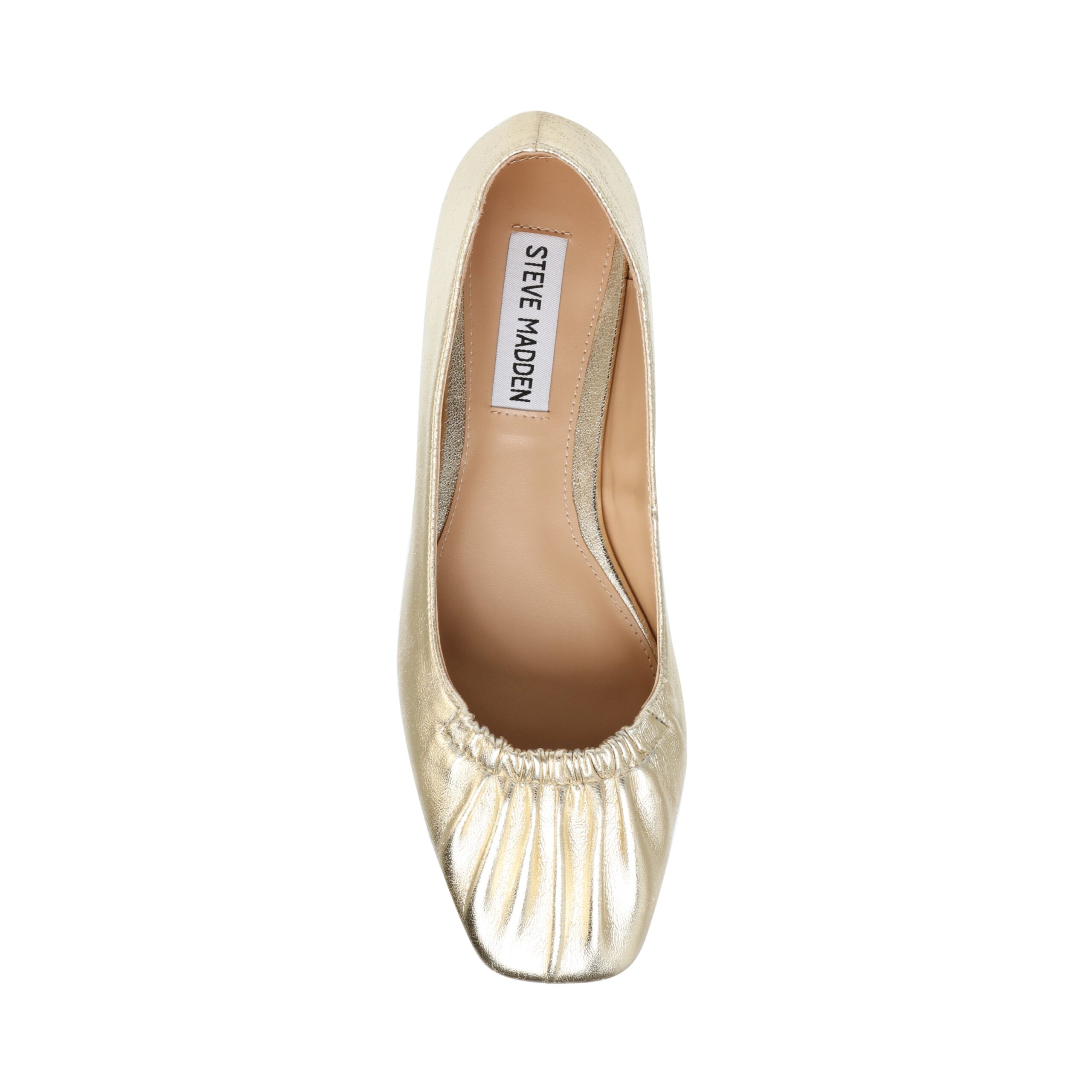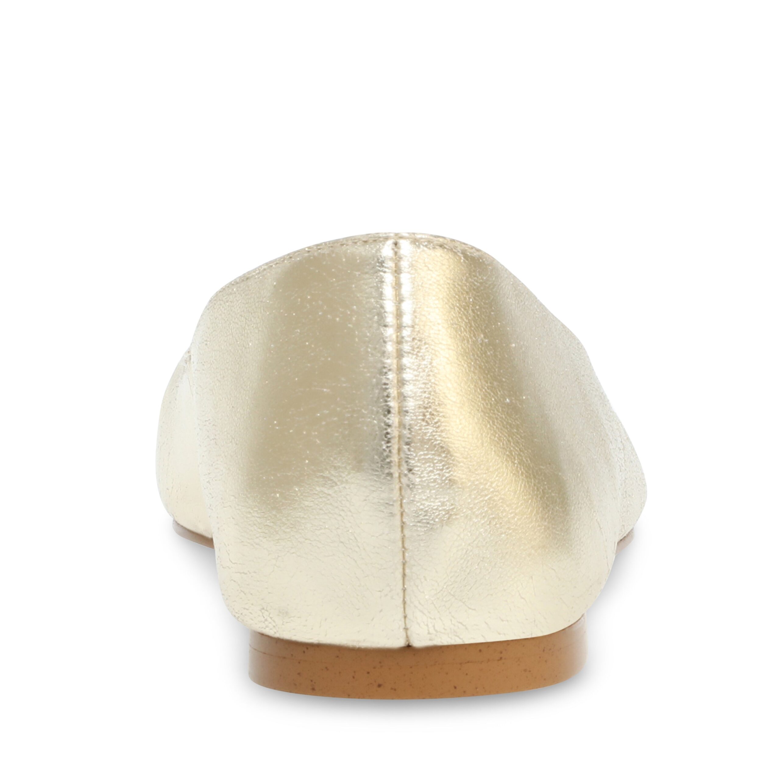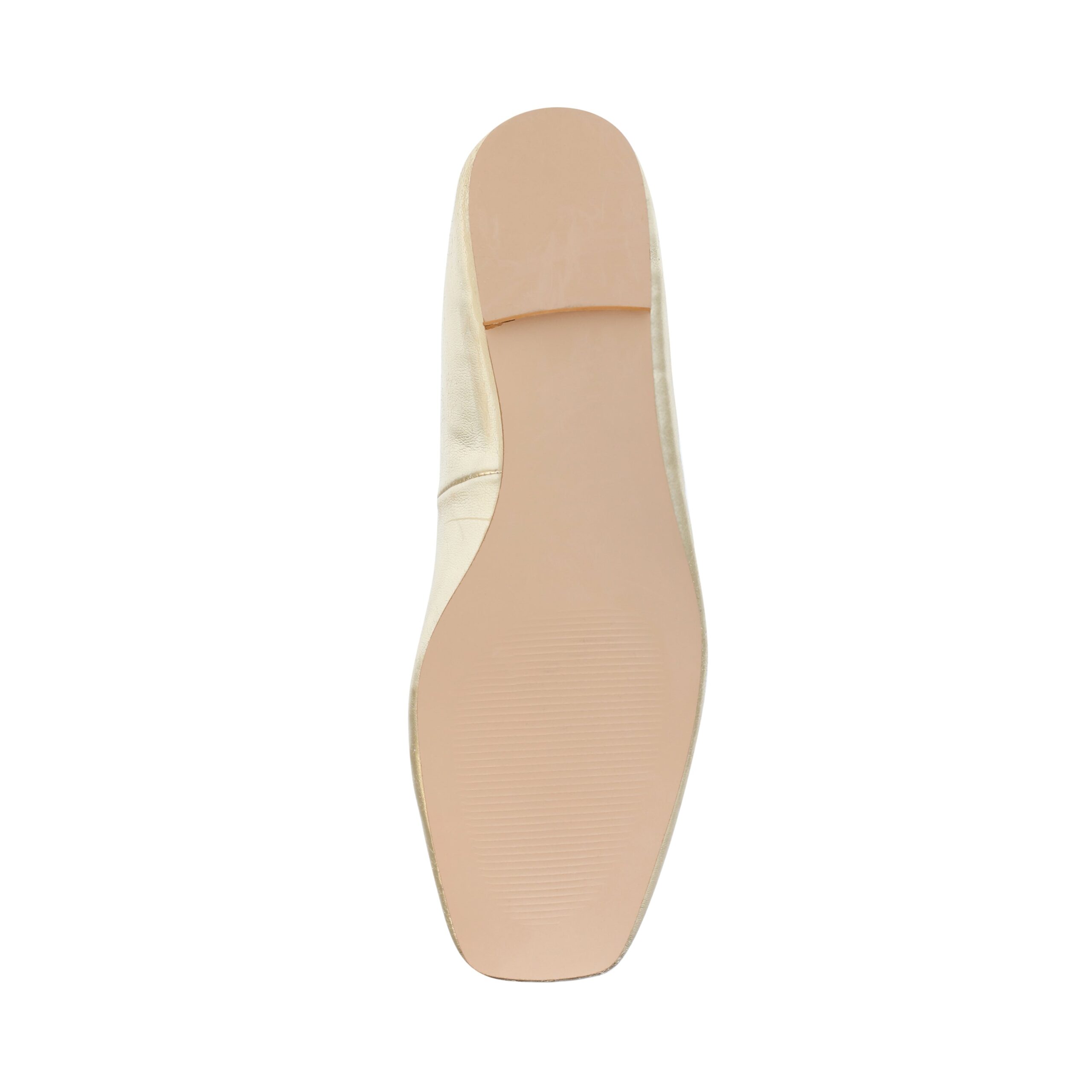 Scarpa ballerina in ecopelle laminata gold, su forma quadrata, morbida e flessibile sottopiede soft e suola in gomma.