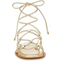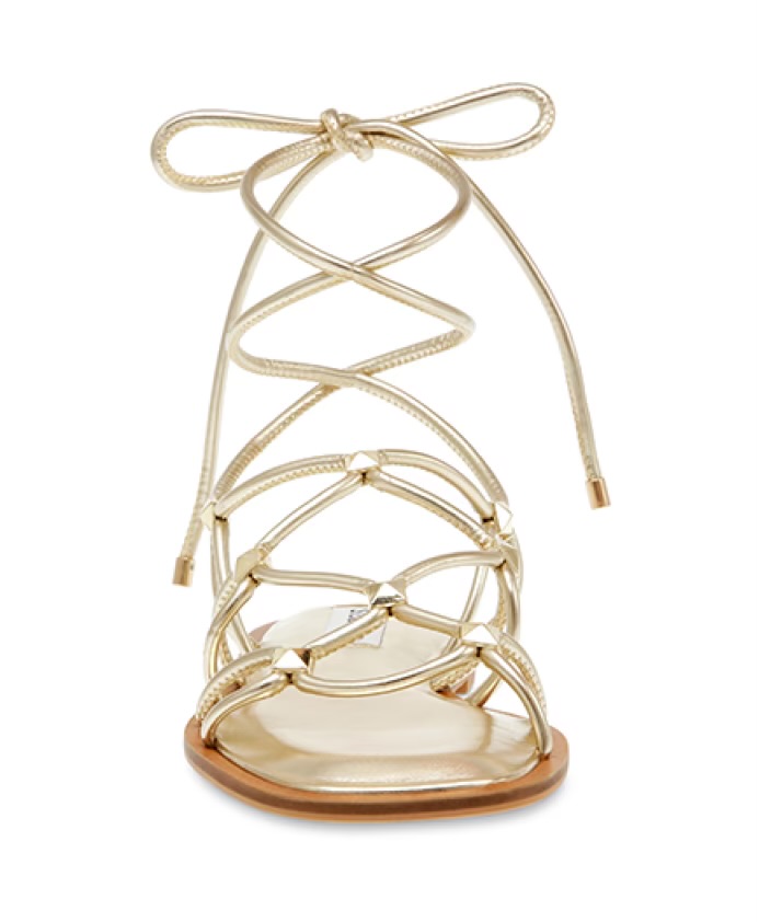Sandalo flat, tomaia tubolare in ecopelle oro fermata da borchie sempre in oro che si intreccia sul piede fino a legarsi alla schiava. Sottopiede con memory e suola gomma.