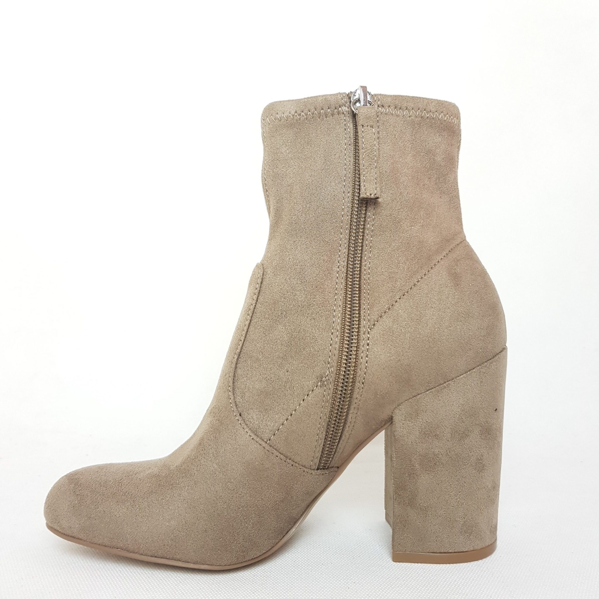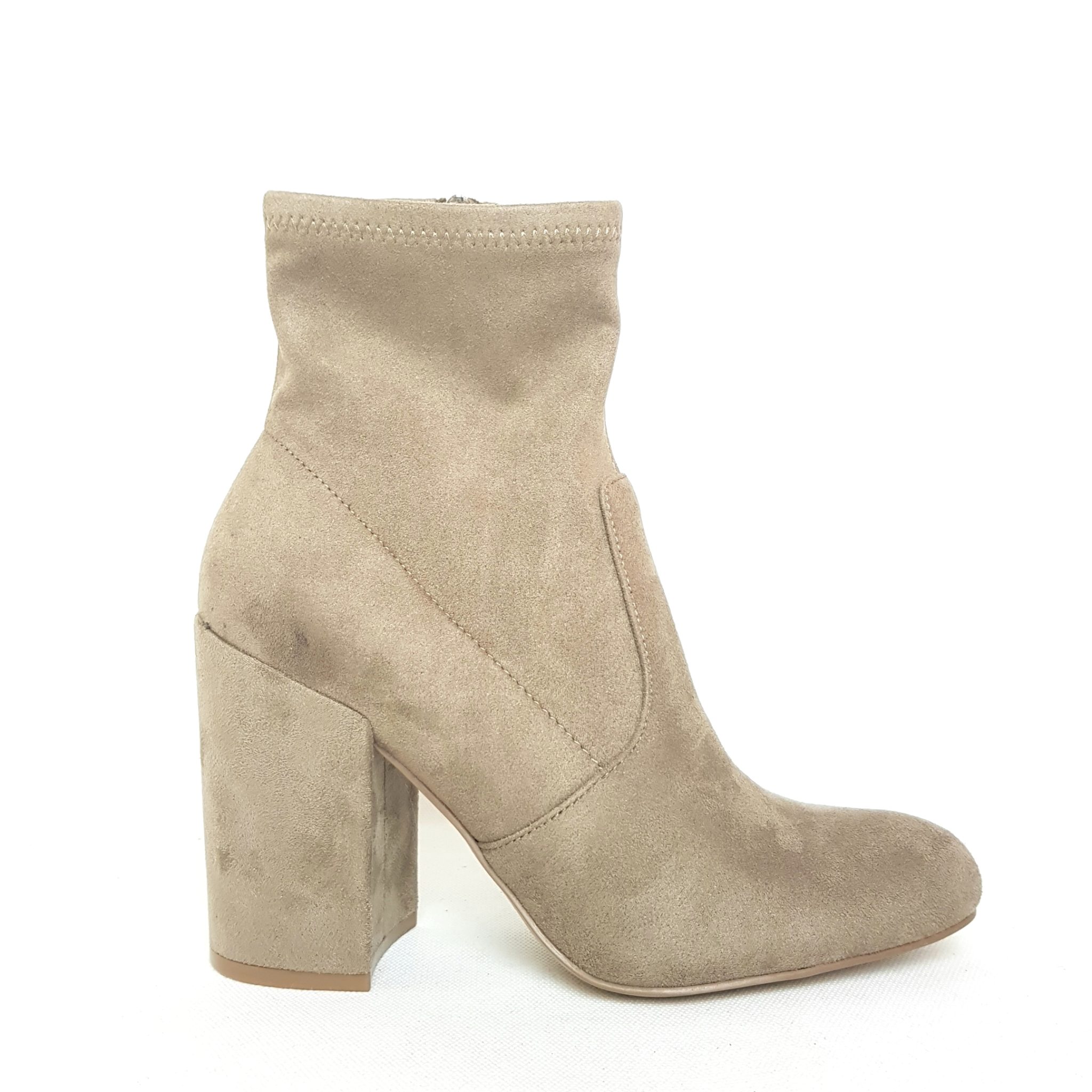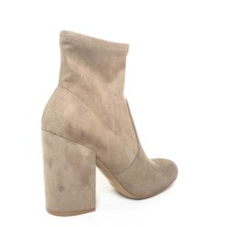 Tronchetto in micro suede, colore taupe. Zip laterale. Altezza sopra la caviglia. Tacco 9,5 cm. Fondo cuoio-gomma