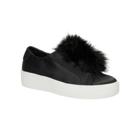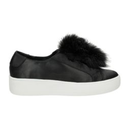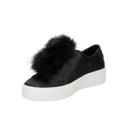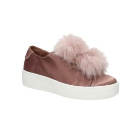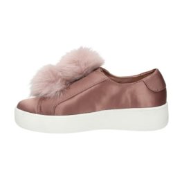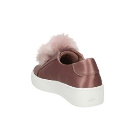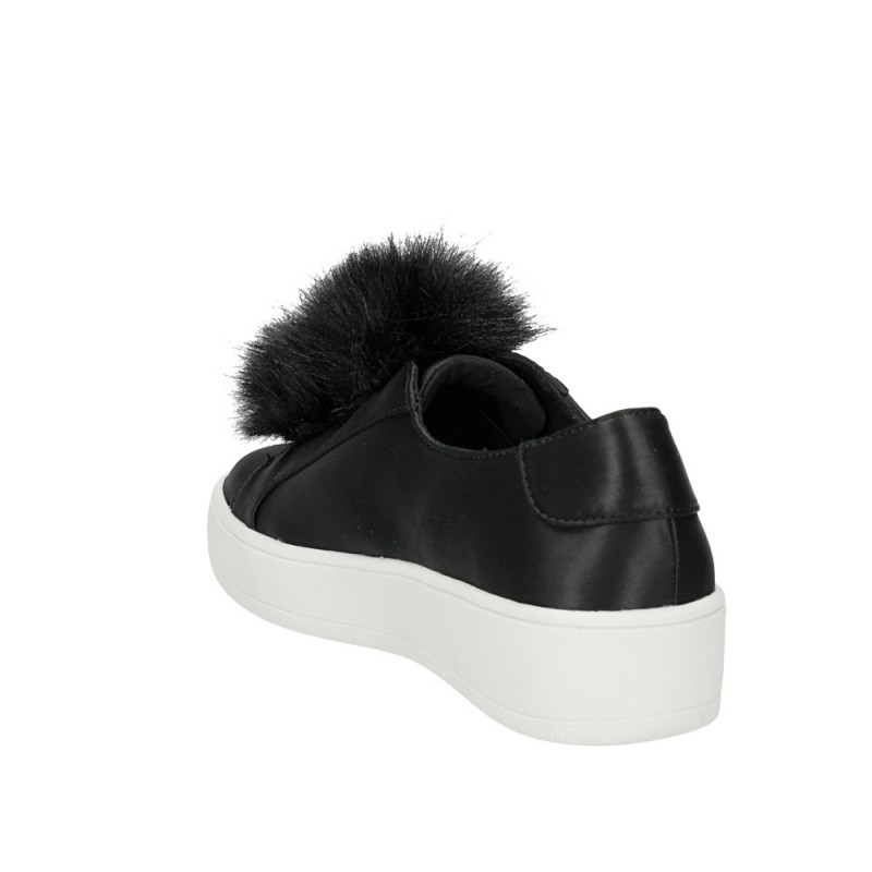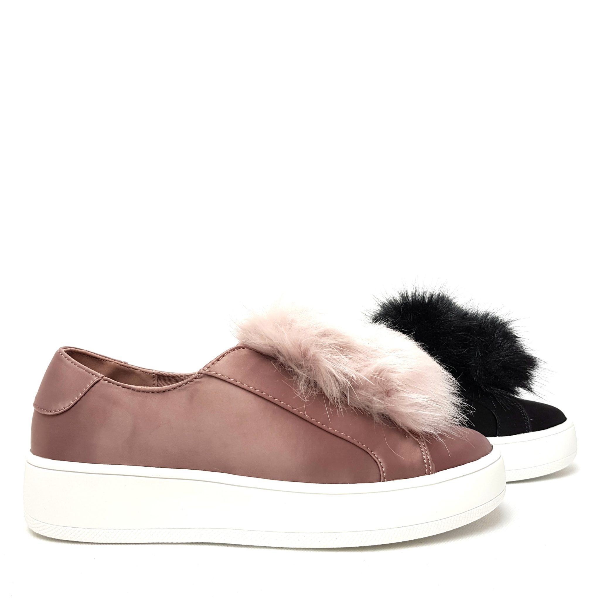 Sneakers slip on in satin rosa blush e nera. Suola in gomma 2,5 cm. Pompons frontali in pelliccia sintetica.