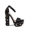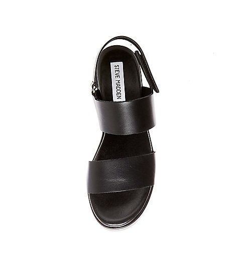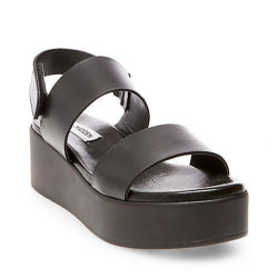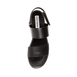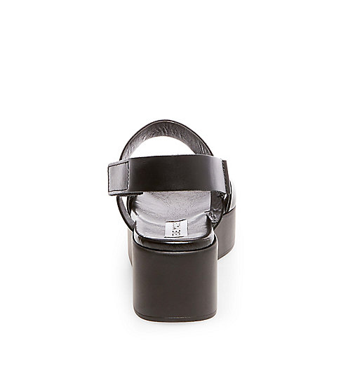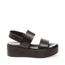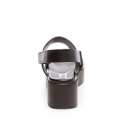 Sandalo in pelle nera. Allacciatura a strappo. Fondo gomma. Altezza tacco 5 cm. Made in Italy. Calzata stretta.