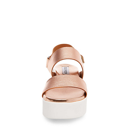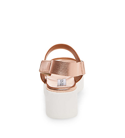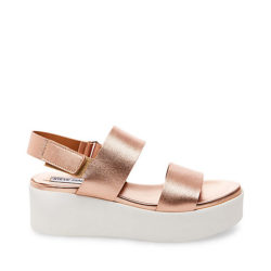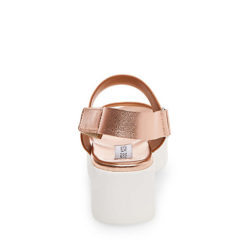 Sandalo in pelle color rose gold. Allacciatura a strappo. Fondo gomma. Para bianca a contrasto. Altezza tacco 5 cm. Made in Italy. Calzata stretta.