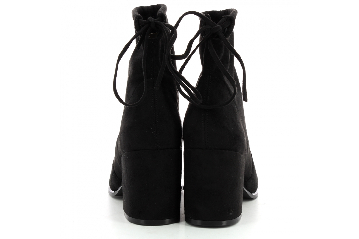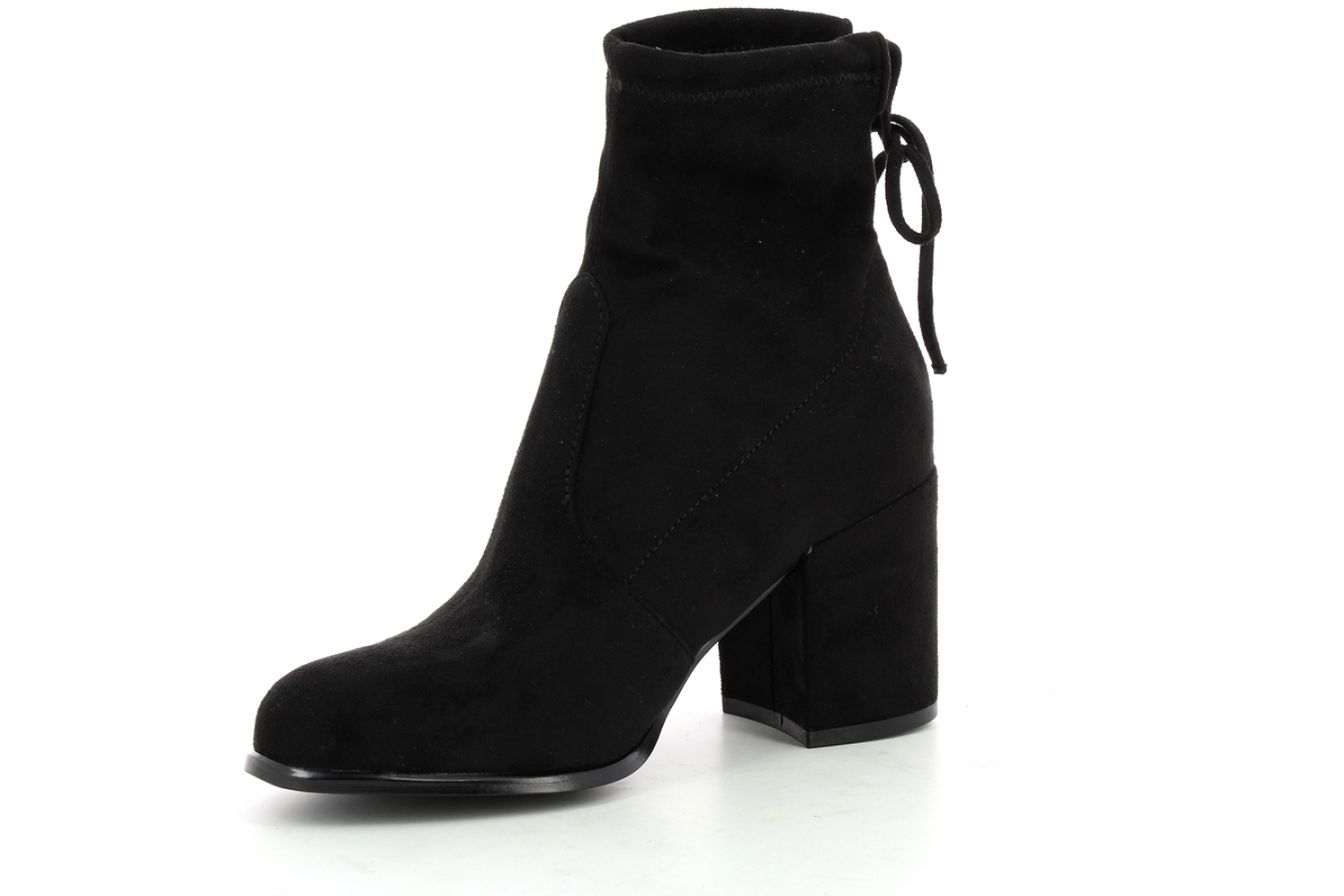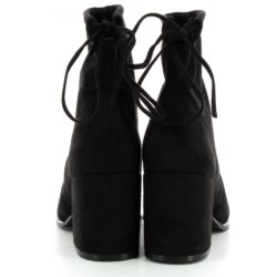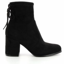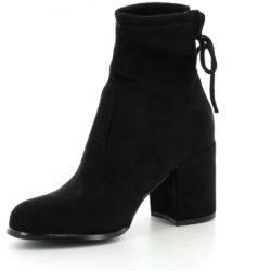 Tronchetto in microfibra nera effetto suede. Fondo eco gomma. Tacco a cubo rivestito 7 cm. Famba regolabile con stringa a fiocchetto sul retro.