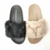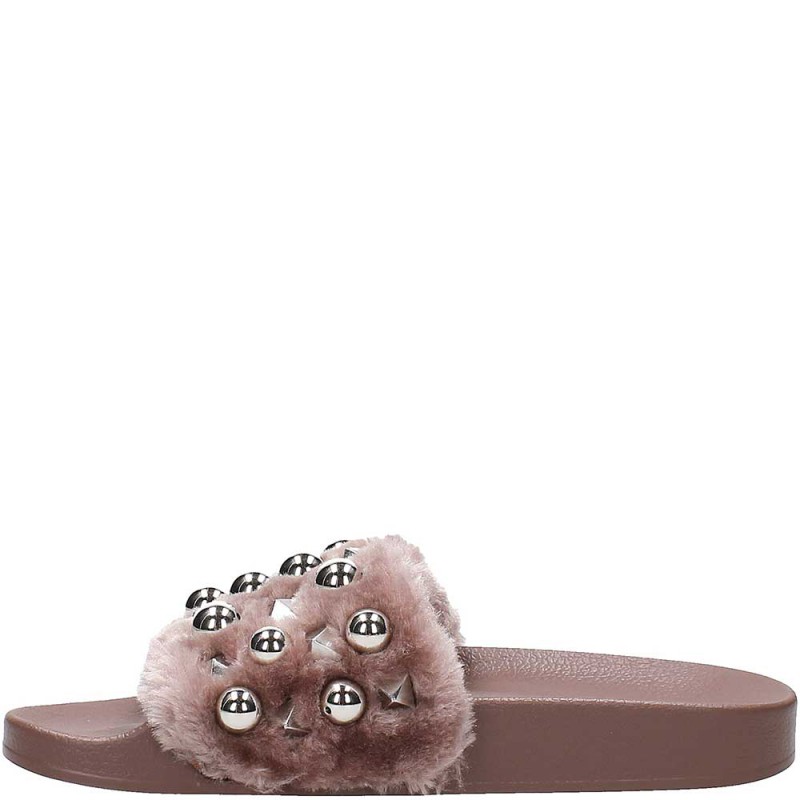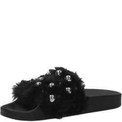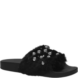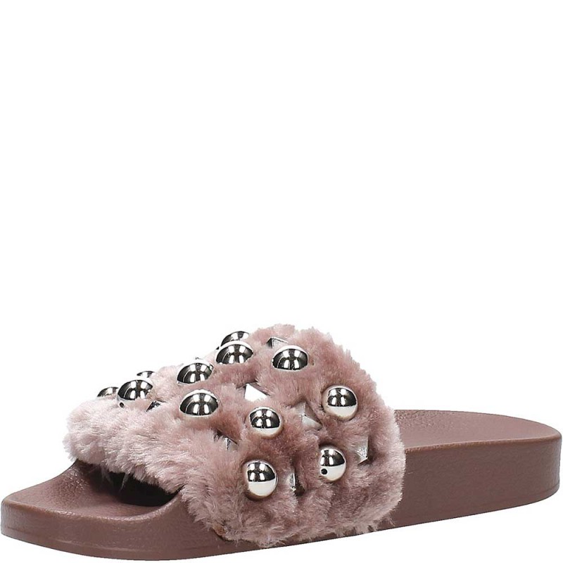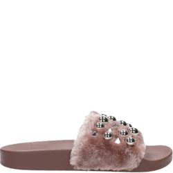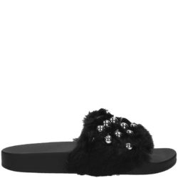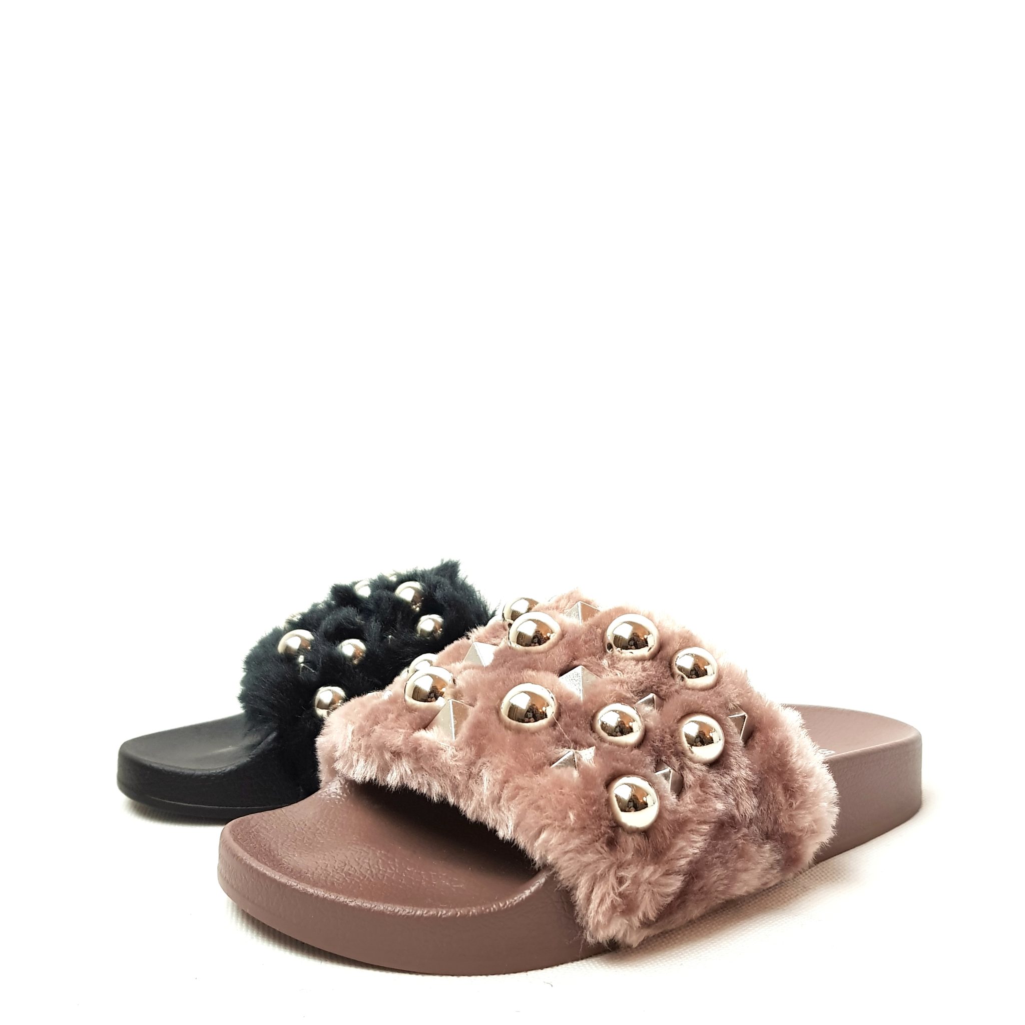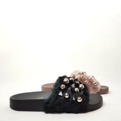 Ciabatta slider in pelliccia sintetica con applicazioni in metallo. Suola plantare. Colori: nero, mauve.