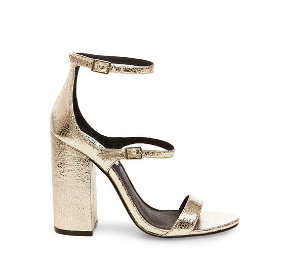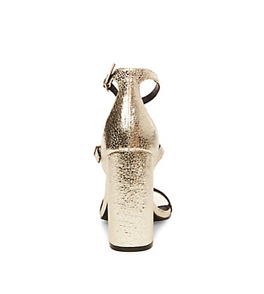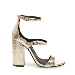 Steve Madden, sandalo con tacco cm 10 in pelle cracrè lamianta oro, sottopiede imbottito suola gomma