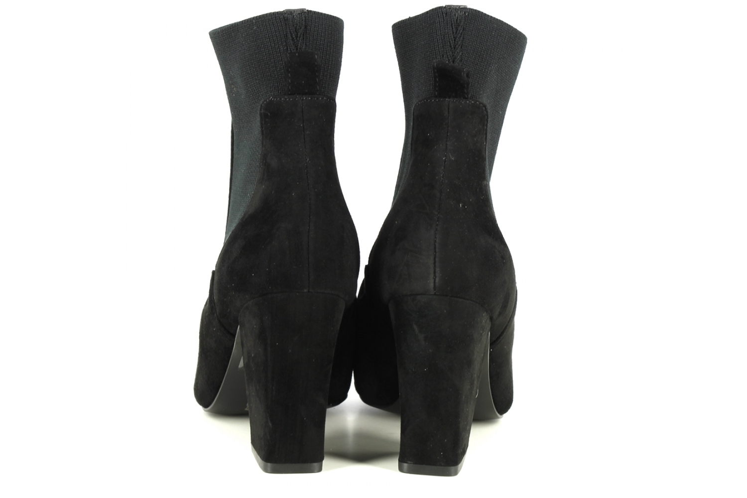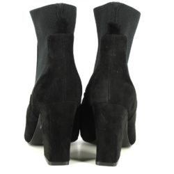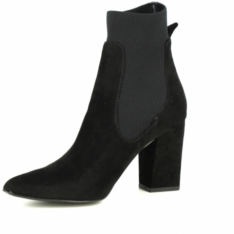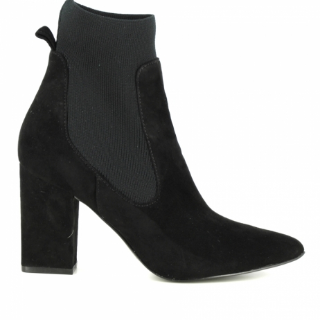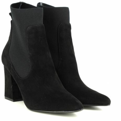 Steve Madden tronchetto in suede nero ed elastico. Tacco a cubo 8,5 cm. Fondo eco cuoio.