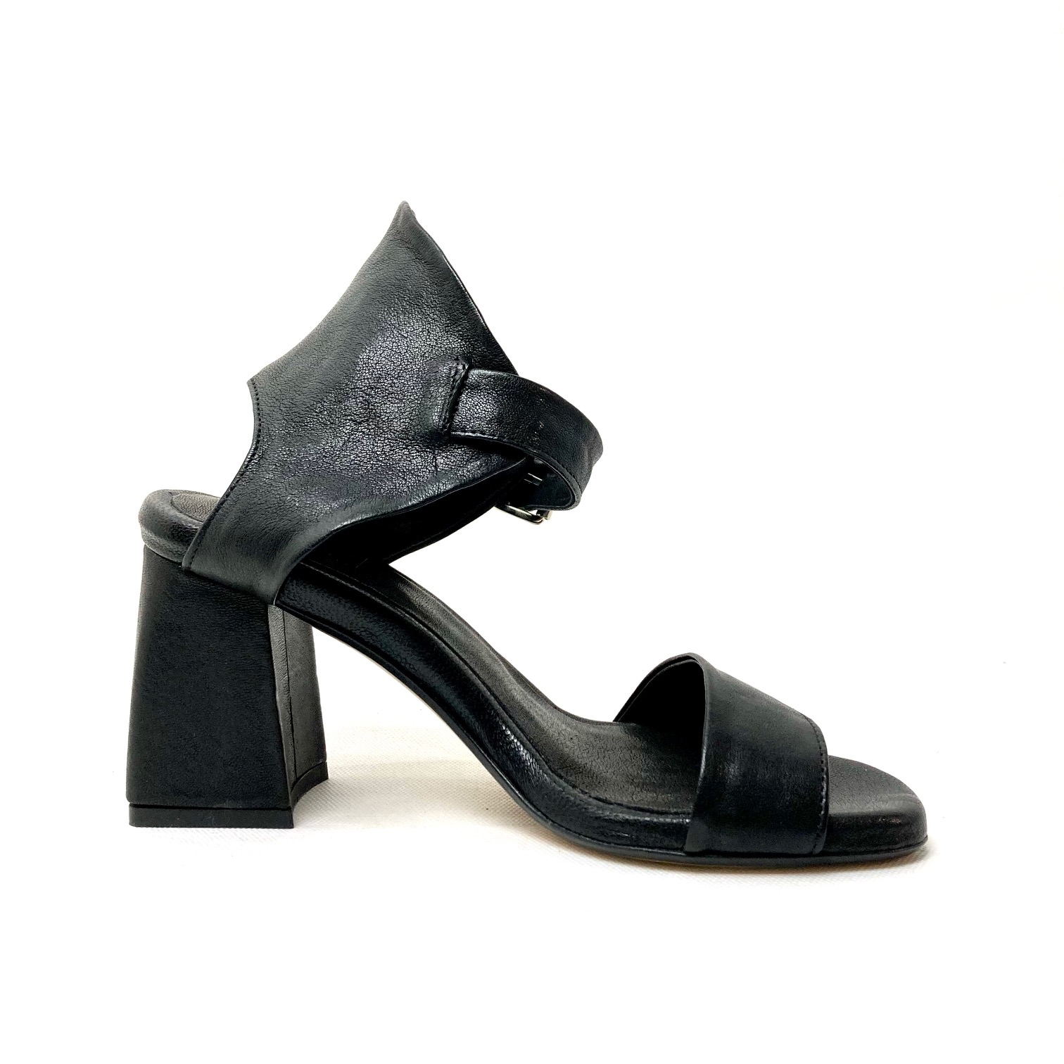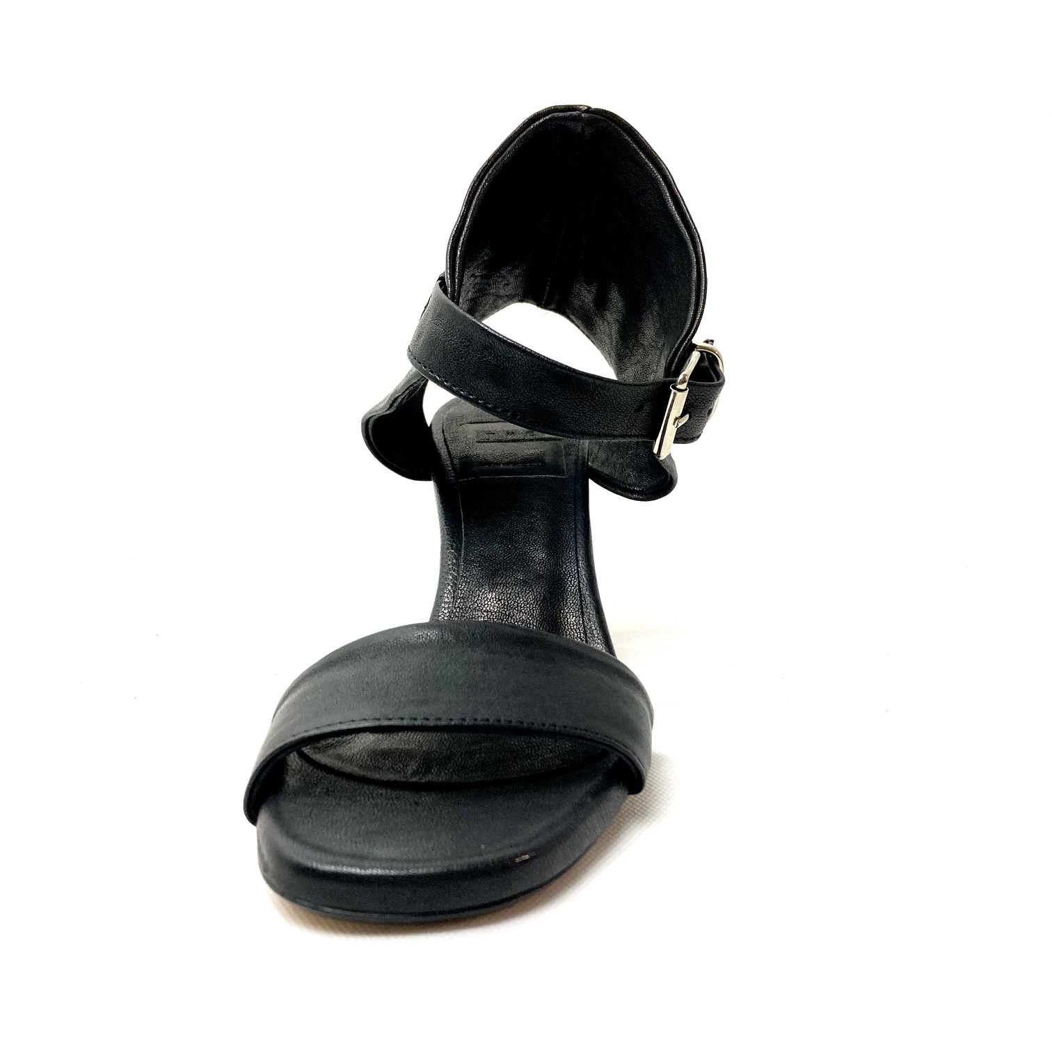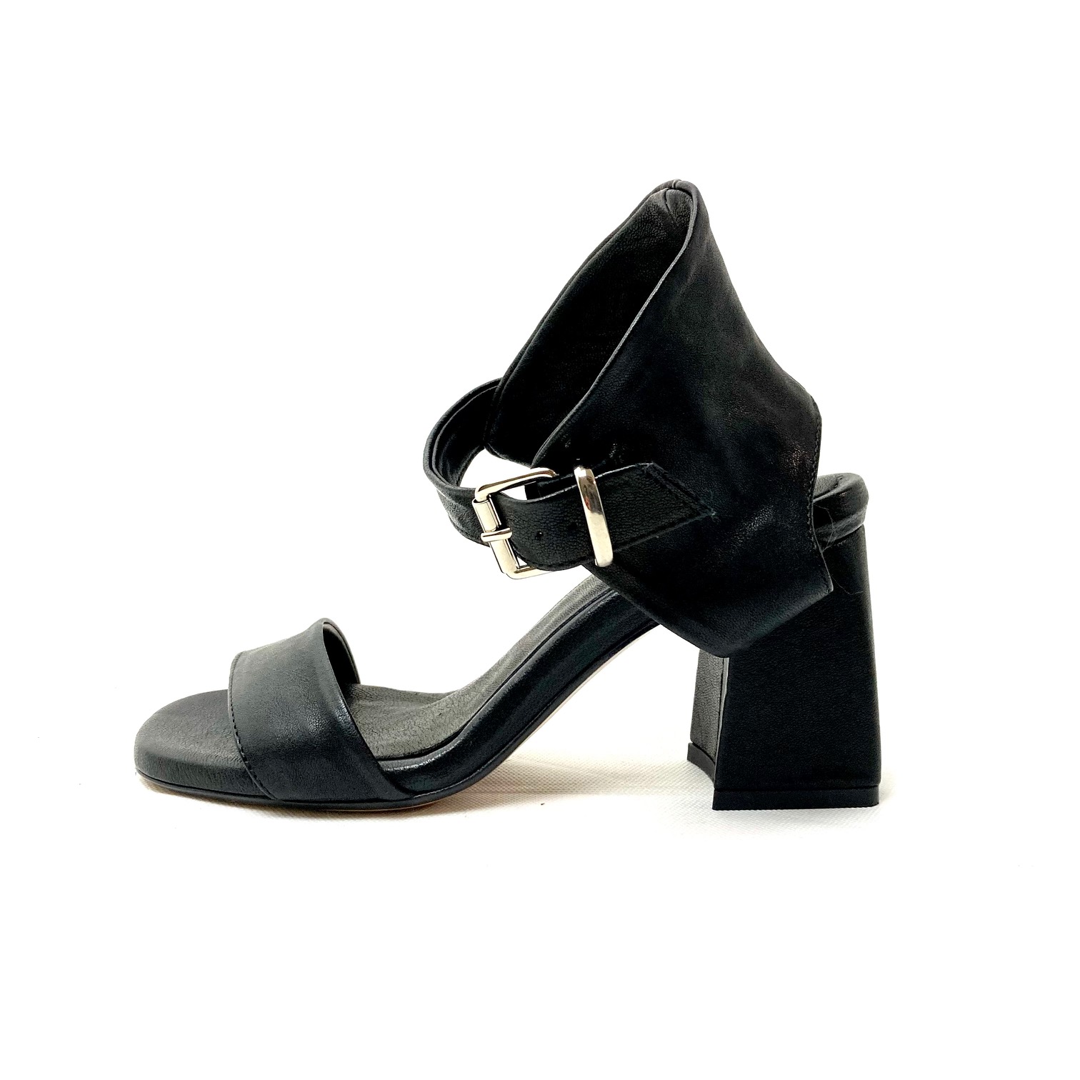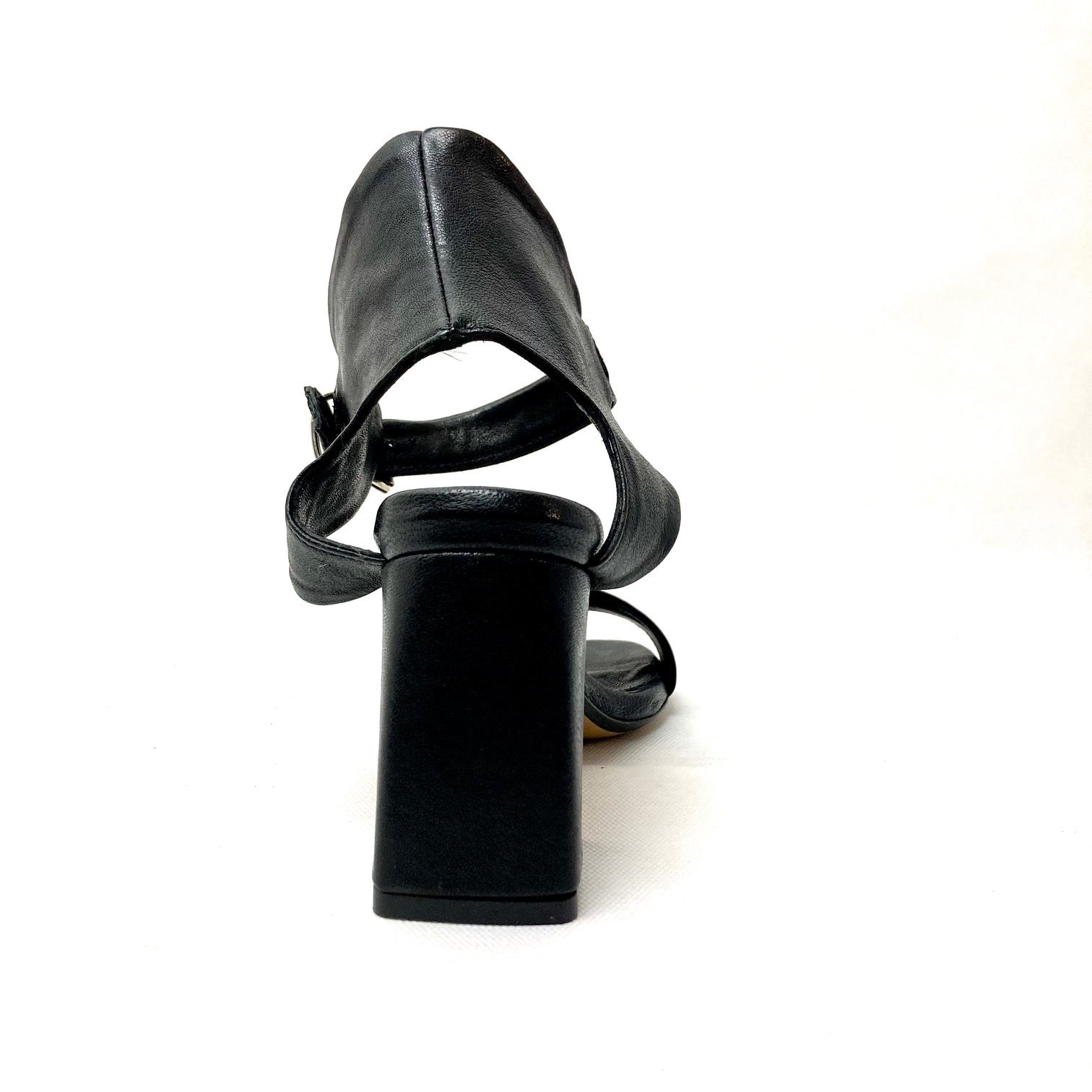 Sandalo in pelle nera allacciato alla caviglia con fibbia cromata e sottopiede con memory. Fodera pelle, suola in vero cuoio, tacco cm 7. 100% Made in Italy.