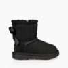 Stivaletto culla in pelle scamosciata effetto metalizzato e fiocco in satin. Chiusura in velcro regolabile. Fodera in lana UGGpure. Soletta in lana UGGpure. Suola in gomma e pelle scamosciata.