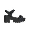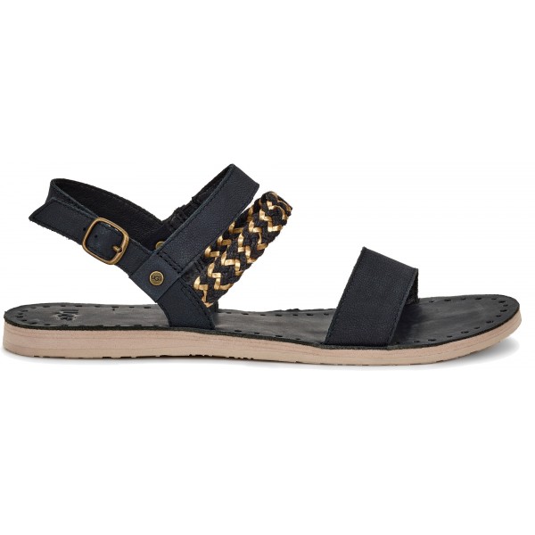 Sandalo in pelle nera e fascia intrecciata nera e oro in juta. Cinturino alla caviglia. Suola in gomma.