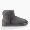 UGG,Classic Mini, stivale in pregiato montone rovesciato e pelle scamosciata pretrattato per essere protetto da acqua e macchie, soletta in vello di pecora, rifiniture in nylon, altezza del gambale: 13,97 cm, suola Treadlite by UGG™, che offre livelli eccezionali di ammortizzazione, resistenza e trazione. Disponibile nei colori: black, grey, spruce, chestnut