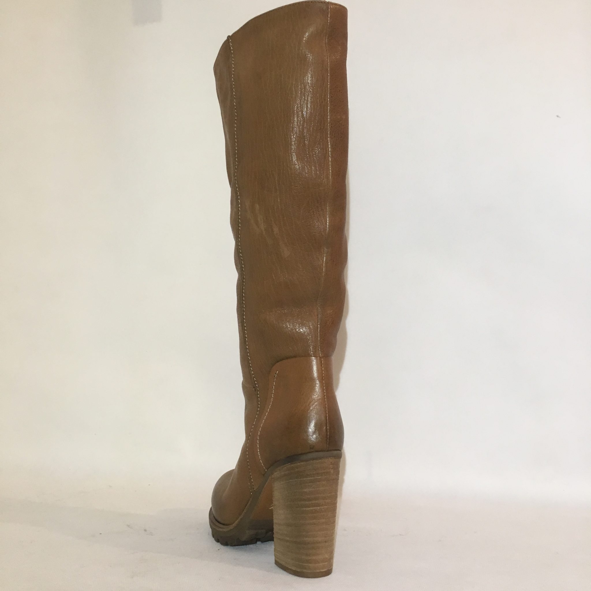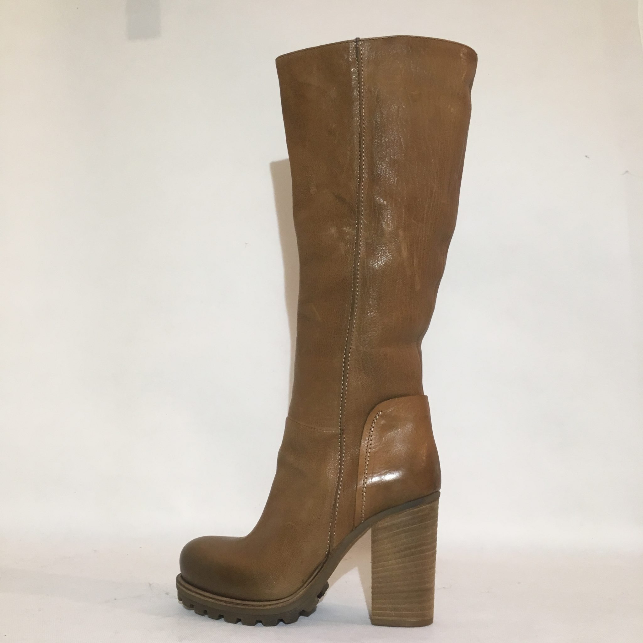 Stivale alto, a tubo, in pelle color cuoio. Fondo gomma/cuoio. Tacco 9 cm. Made in Italy