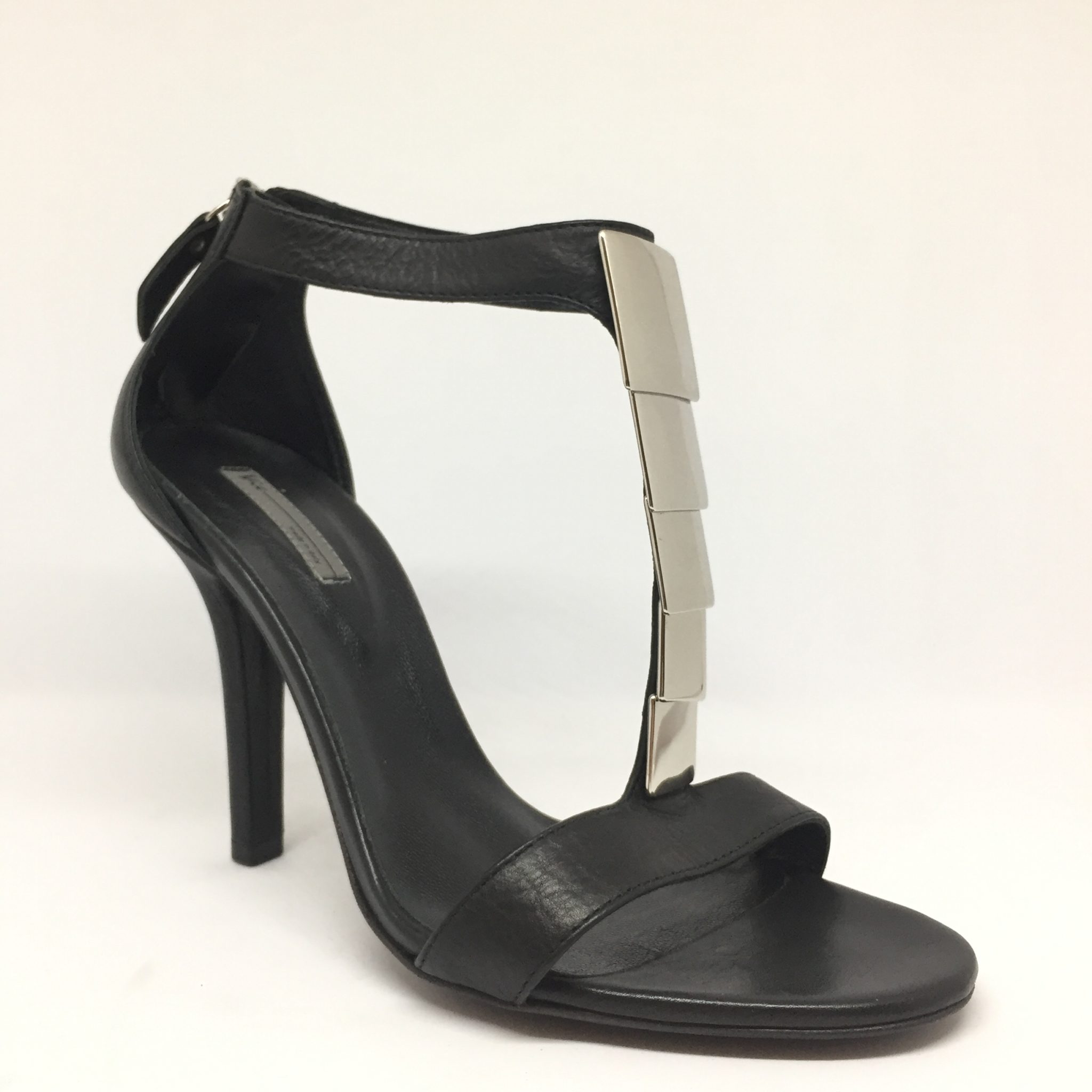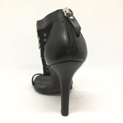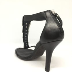 Sandalo in pelle nera con applicazione metallica argento. Zip sul tallone. Fondo gomma. Tacco 10 cm.