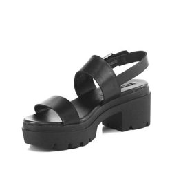Sandalo in pelle nero a doppia fascia, chiusura con laccio posteriore e fibbia. Altezza 6 cm, platform 3,5 cm. Calzata stretta.