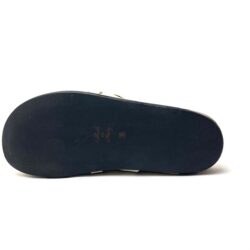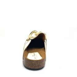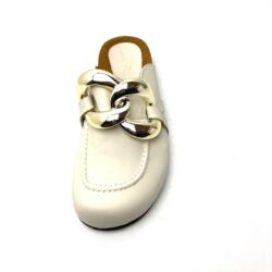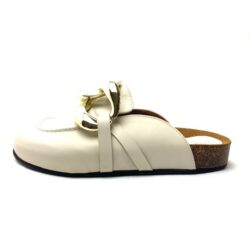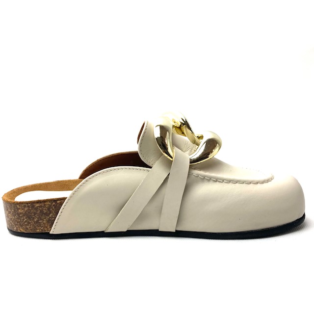 Ciabatta modello mules in pelle avorio con plantare anatomico in sughero foderato pelle col cuoio. Tomaia con accessorio in catena molto grande color oro pallido. Suola h cm 2,5 fondo gomma. 100% Made in Italy.