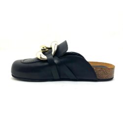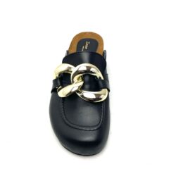 Ciabatta modello mules in pelle nera con plantare anatomico in sughero foderato pelle col cuoio. Tomaia con accessorio in catena molto grande color oro pallido. Suola h cm 2,5 fondo gomma. 100% Made in Italy.