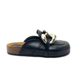Ciabatta modello mules in pelle nera con plantare anatomico in sughero foderato pelle col cuoio. Tomaia con accessorio in catena molto grande color oro pallido. Suola h cm 2,5 fondo gomma. 100% Made in Italy.