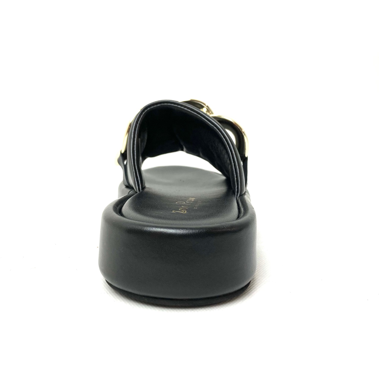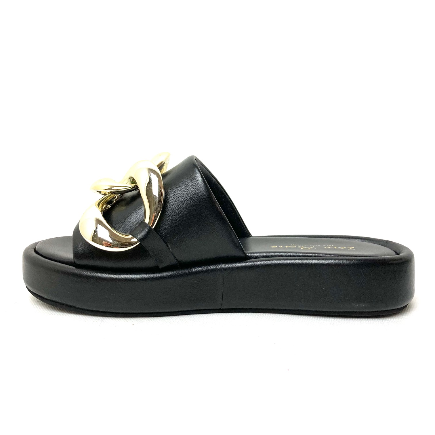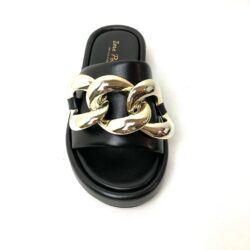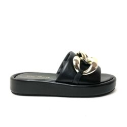 Ciabattone in pelle nera con fascia imbottita e accessorio catena grande color oro pallido, fodera pelle, sottopiede imbottito suola platform cm 3, fondo gomma. 100% Made in Italy