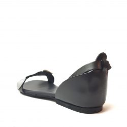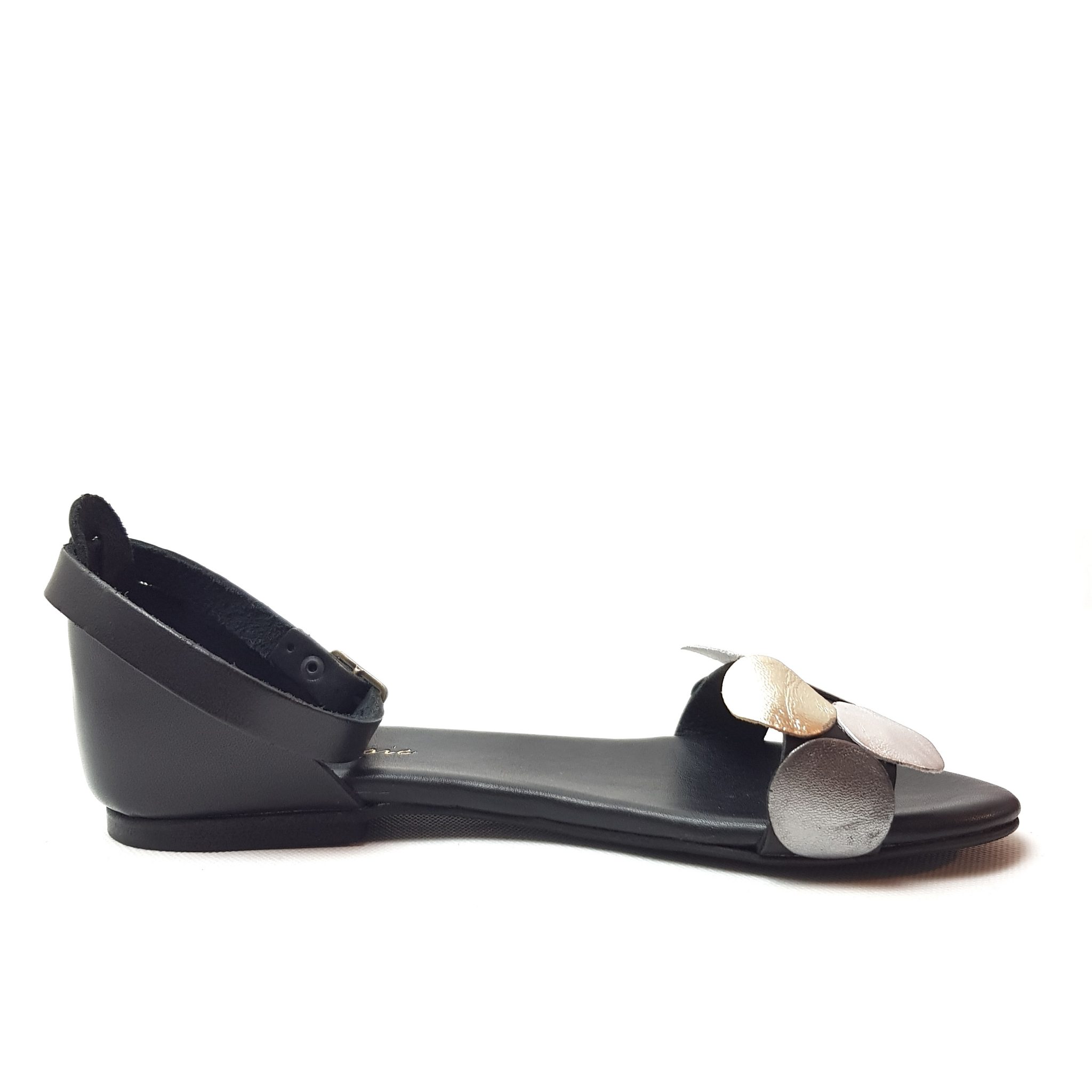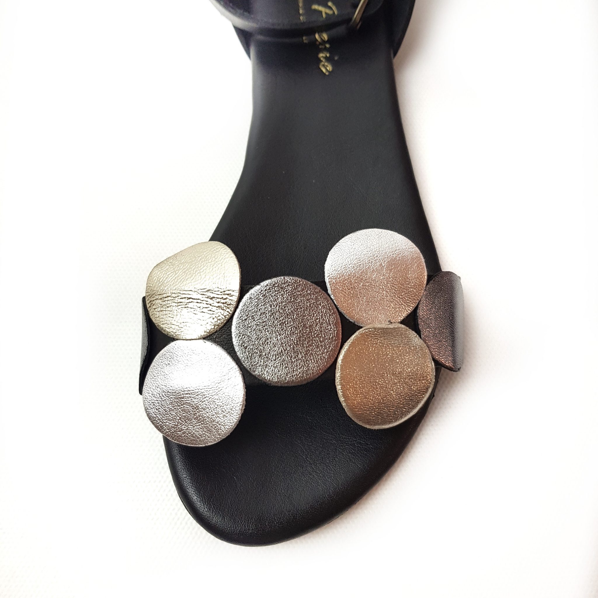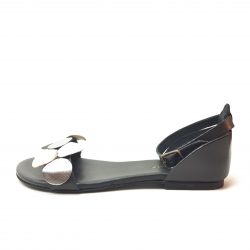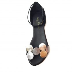 Zero Poesie sandalo a fascia in pelle nera. Applicazioni a pois argento e piombo sulle fascia. Allacciatura regolabile, tallone chiuso Fondo gomma. Made in Italy.