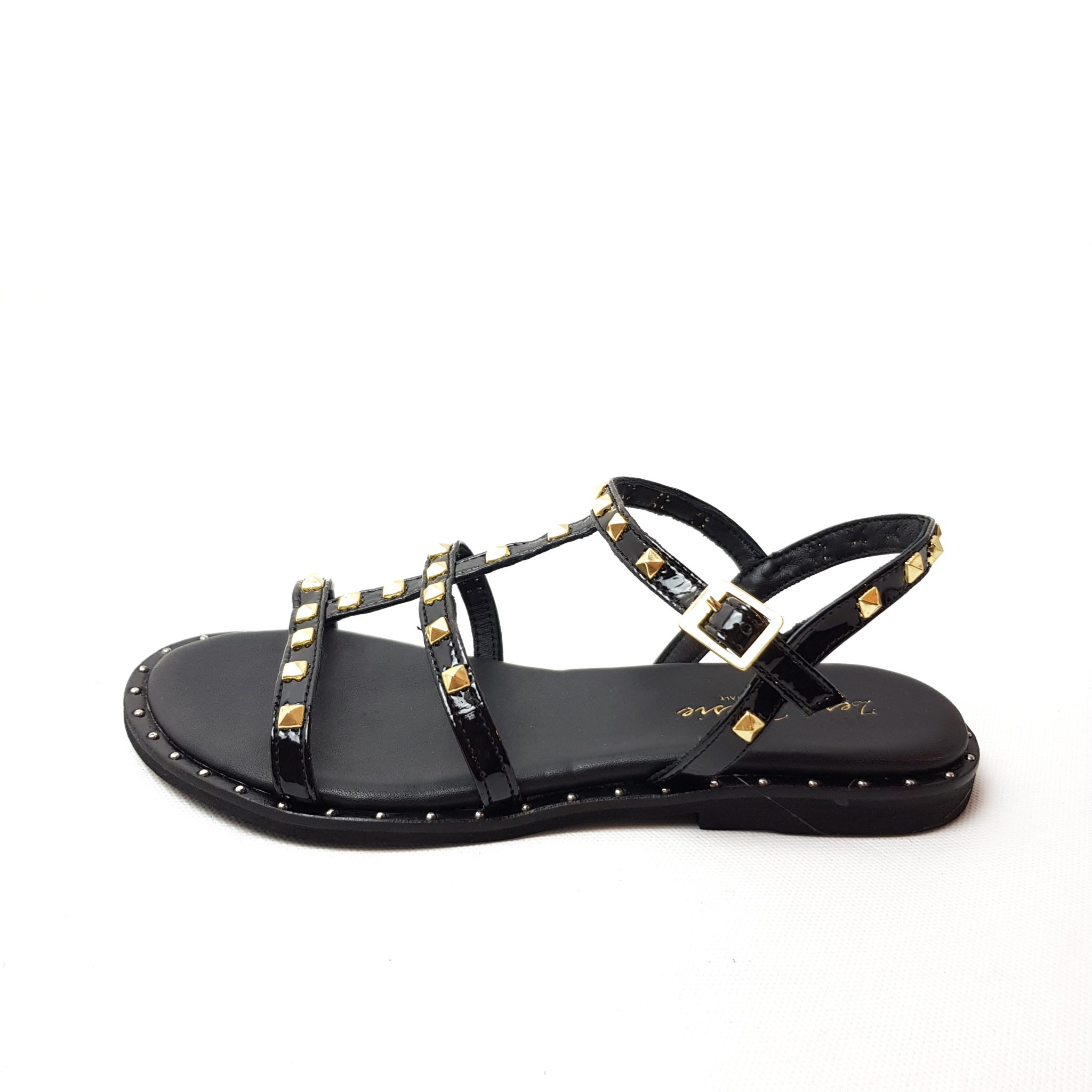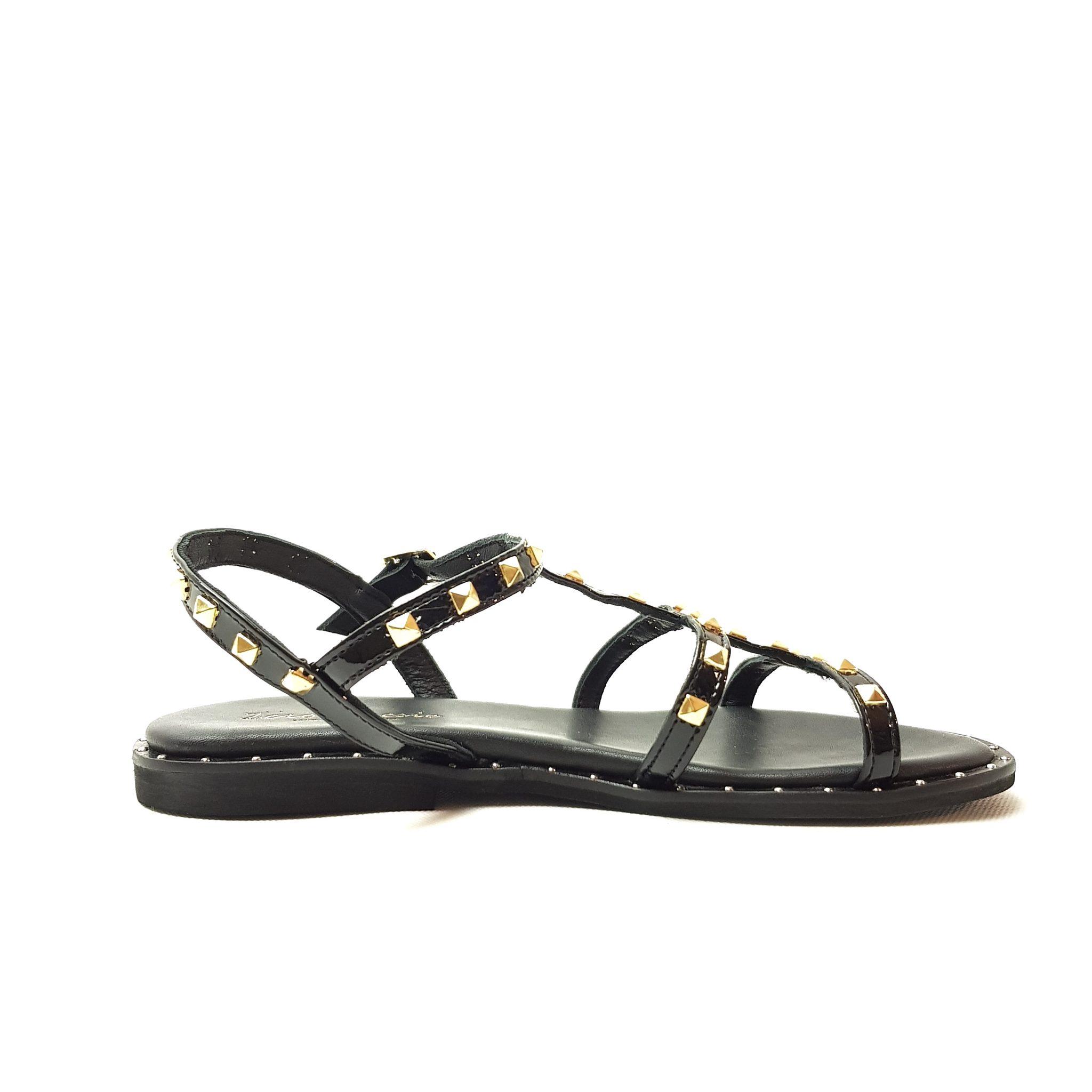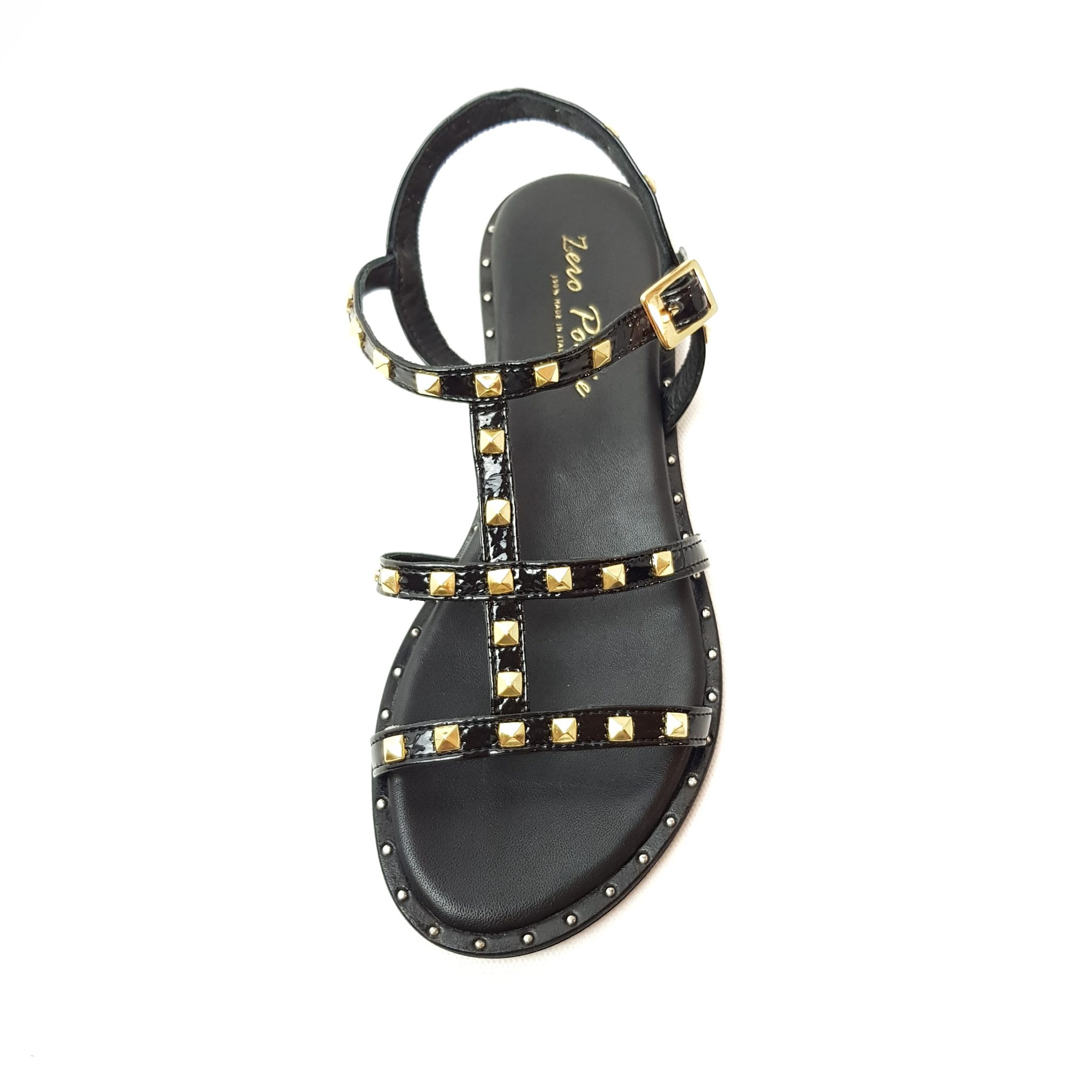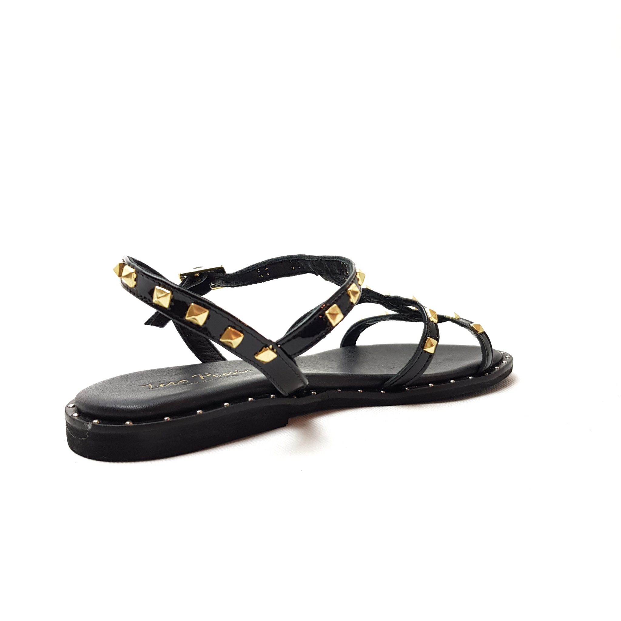 Zero Poesie sandalo multi lace in pelle nero lack con dettaglio borchie dorate. Allacciatura regolabile. Fondo gomma. Made in italy.